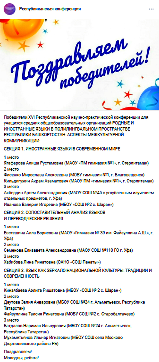 26 марта в стенах Акмуллинского университета состоялась XVI Республиканская научно-практическая конференция для учащихся средних общеобразовательных организаций «Родные и иностранные языки в полилингвальном пространстве Республики Башкортостан: аспекты межкультурной коммуникации». Старший преподаватель кафедры иностранных языков О. Е. Кулешова выступила руководителем секции «Язык как зеркало национальной культуры: традиции и современность».
