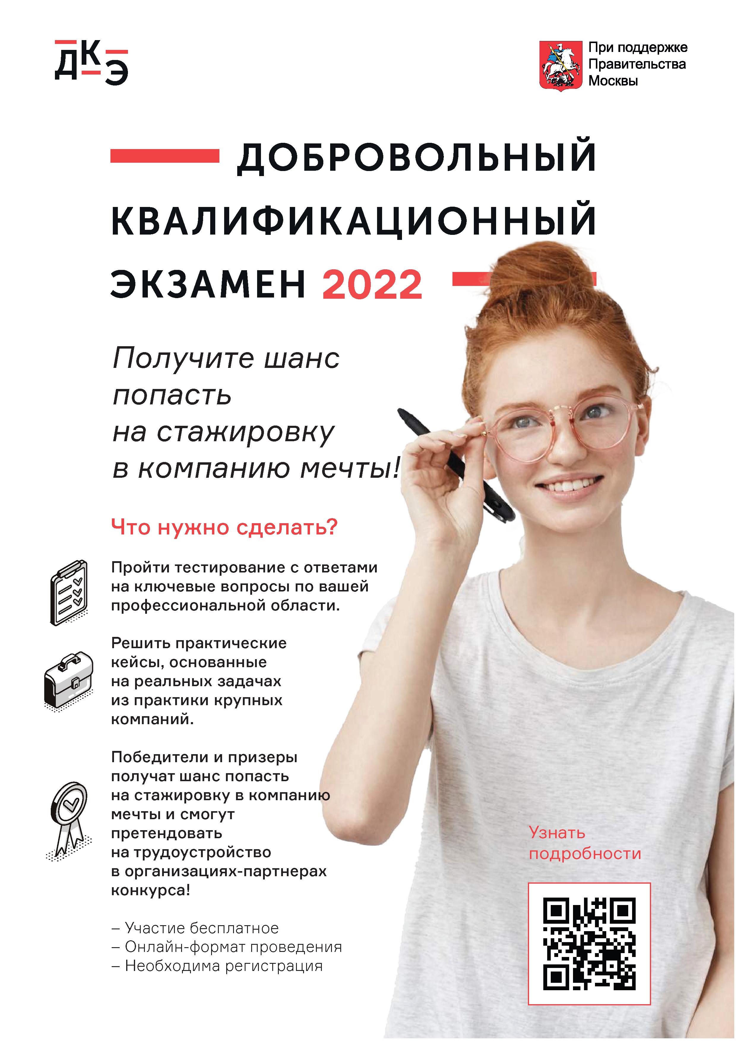 Добровольный квалификационный экзамен – это проект, в котором вы можете проверить свои знания и понять, соответствует ли ваш уровень подготовки требованиям работодателей. Лучшие смогут пройти стажировку  в крупнейших компаниях Москвы: