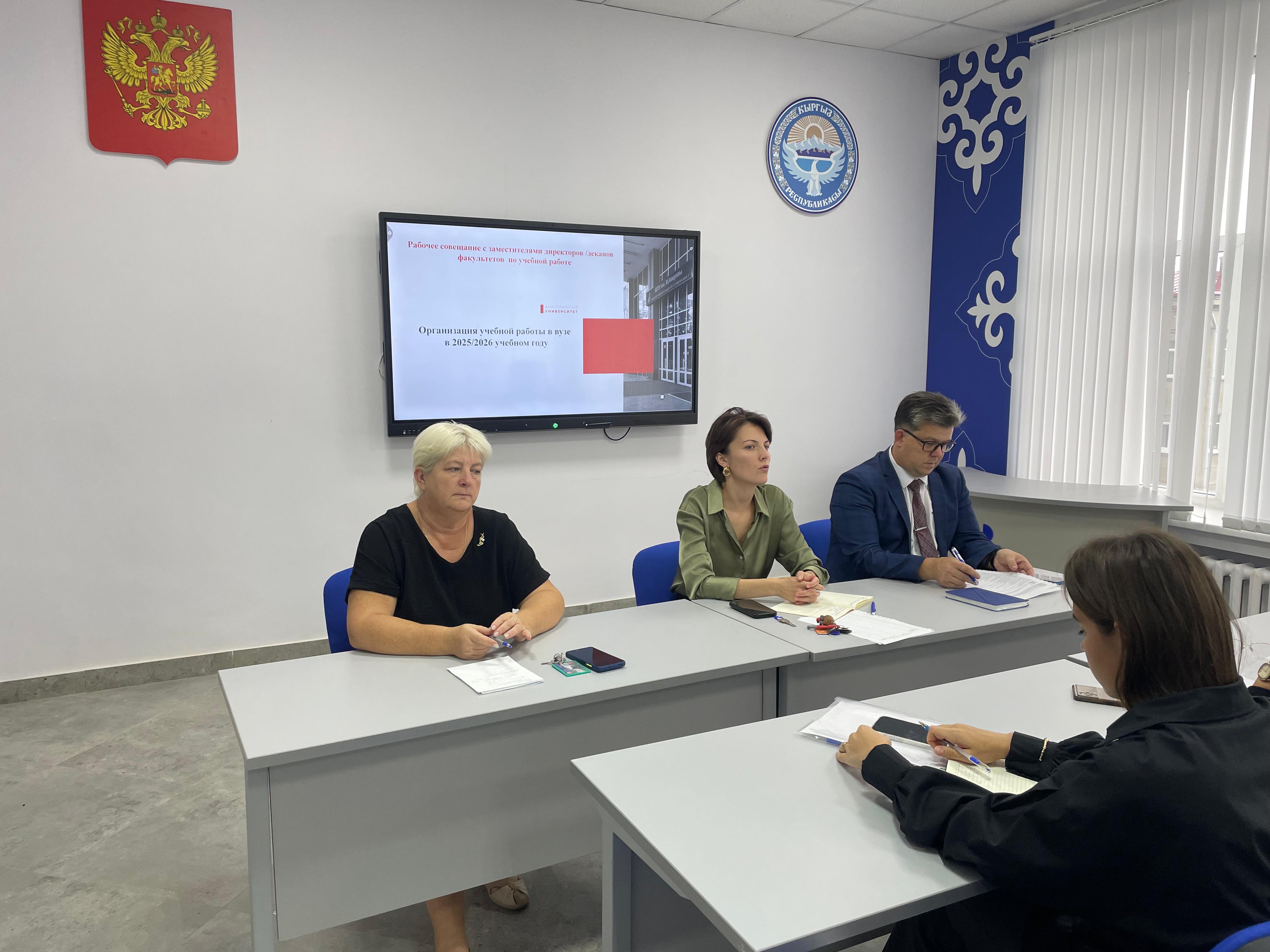 В рамках подготовки к новому учебному году 5 сентября 2025 года состоялось рабочее совещание на тему «Организация учебной деятельности в университете в 2025/2026 учебном году» с участием заместителей деканов и директоров факультетов по учебной работе, проректора по учебно-методической деятельности Габдрахмановой К.В., а также сотрудников учебно-методического департамента. Проректором были определены ключевые приоритеты учебно-методической деятельности университета, сформулированы цели и задачи предстоящего учебного периода, утвержденные решением ученого совета вуза. Были поставлены следующие задачи: обеспечение готовности перехода итоговой аттестации в формат демонстрационного экзамена профессиональной направленности; обновление рабочих программ дисциплин согласно новым требованиям учебных пособий; пересмотр содержательной части образовательных программ прохождения практик для раннего формирования профессиональных компетенций обучающихся. Директор учебно-методического департамента Мусифуллин С.Р. подчеркнул важность укрепления предметных и методологических компетенций студентов, повышение уровня профессиональной подготовки преподавателей-методистов, а также внедрение единого подхода к формированию и проведению педагогических практик начиная с первого курса. Особое внимание было уделено вопросам своевременного оформления и представления необходимой документации (приказов, отчетов, соглашений).