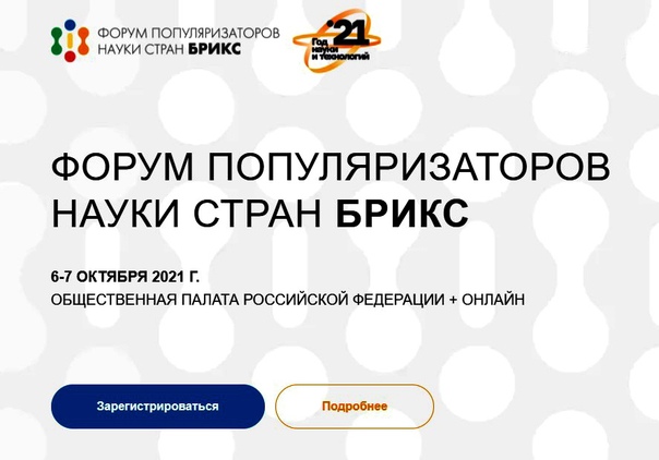 6-7 октября 2021 года в Москве, в Общественной палате Российской Федерации, состоится Форум популяризаторов науки стран БРИКС. Организаторами его выступают Комиссия Общественной палаты Российской Федерации по развитию высшего образования и науки совместно с секретариатом Российского Совета по научно-техническому и инновационному сотрудничеству стран БРИКС. Форум проводится в рамках Года науки и технологий в Российской Федерации при поддержке Министерства науки и высшего образования Российской Федерации и Комиссии Российской Федерации по делам ЮНЕСКО.