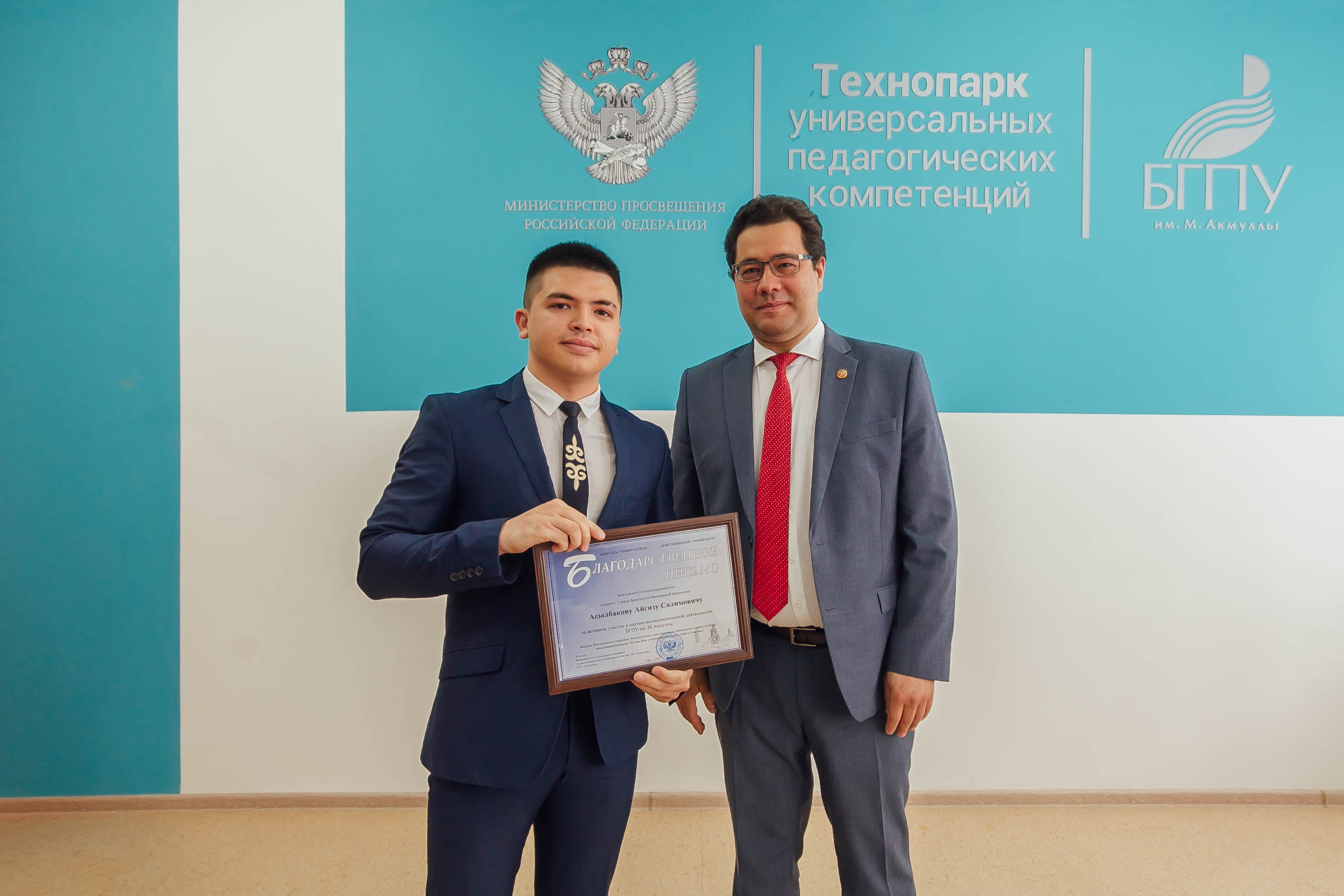 Первый заместитель Премьер-министра Правительства Башкортостана поздравил студентов и руководство университета с праздником и вручил ректору вуза сертификат от Правительства региона на 15 млн рублей. Эти деньги будут направлены на реализацию в вузе научных программ Евразийского НОЦ и стратегическое развитие университета. Такую поддержку вузам региона в январе 2022 года анонсировал Глава Башкортостана Радий Хабиров, поздравляя Башгоспедуниверситет с 55-летним юбилеем.