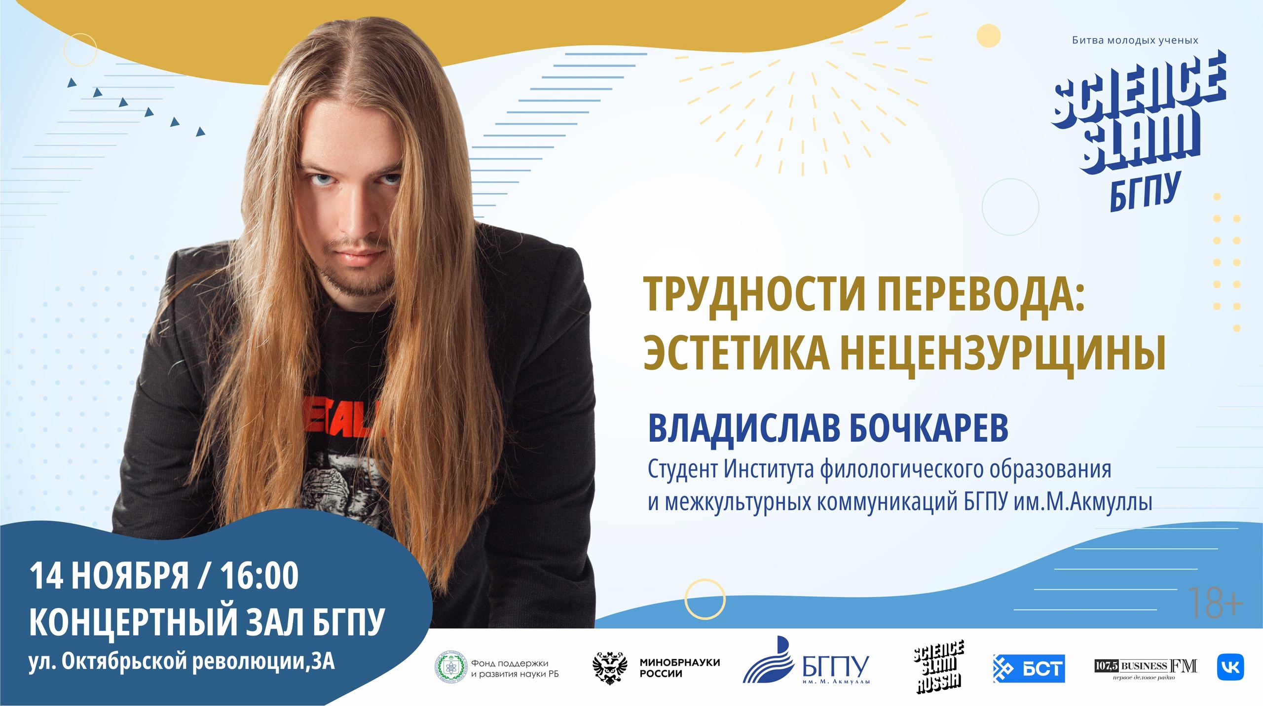• студент Института филологического образования и межкультурных коммуникаций Владислав Бочкарев. Он расскажет о специфике перевода ненормативной лексики и ее необходимости при адаптации языкового паспорта личности;