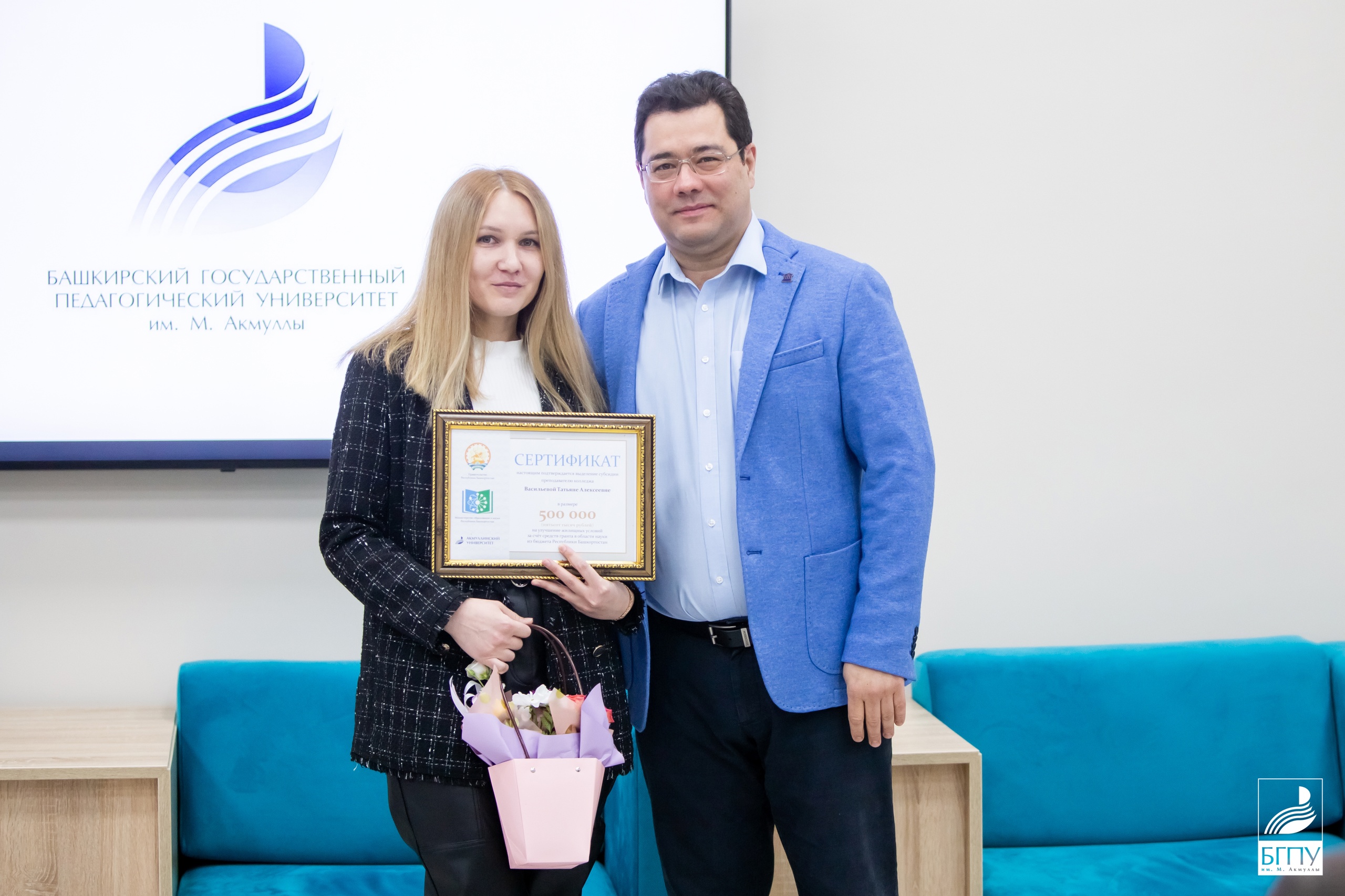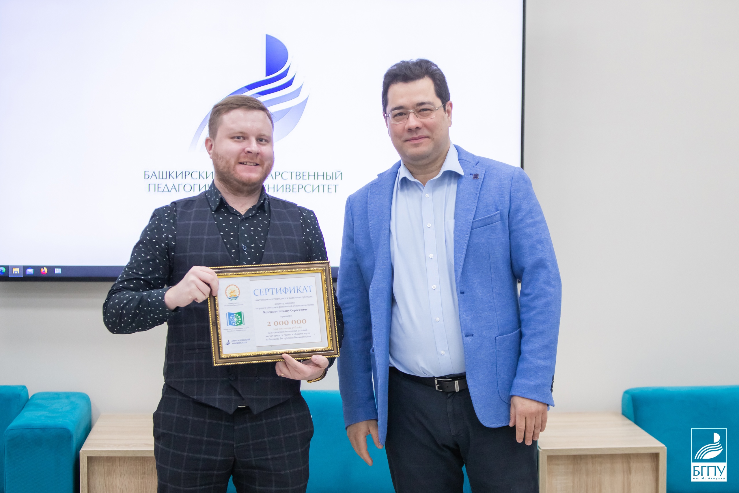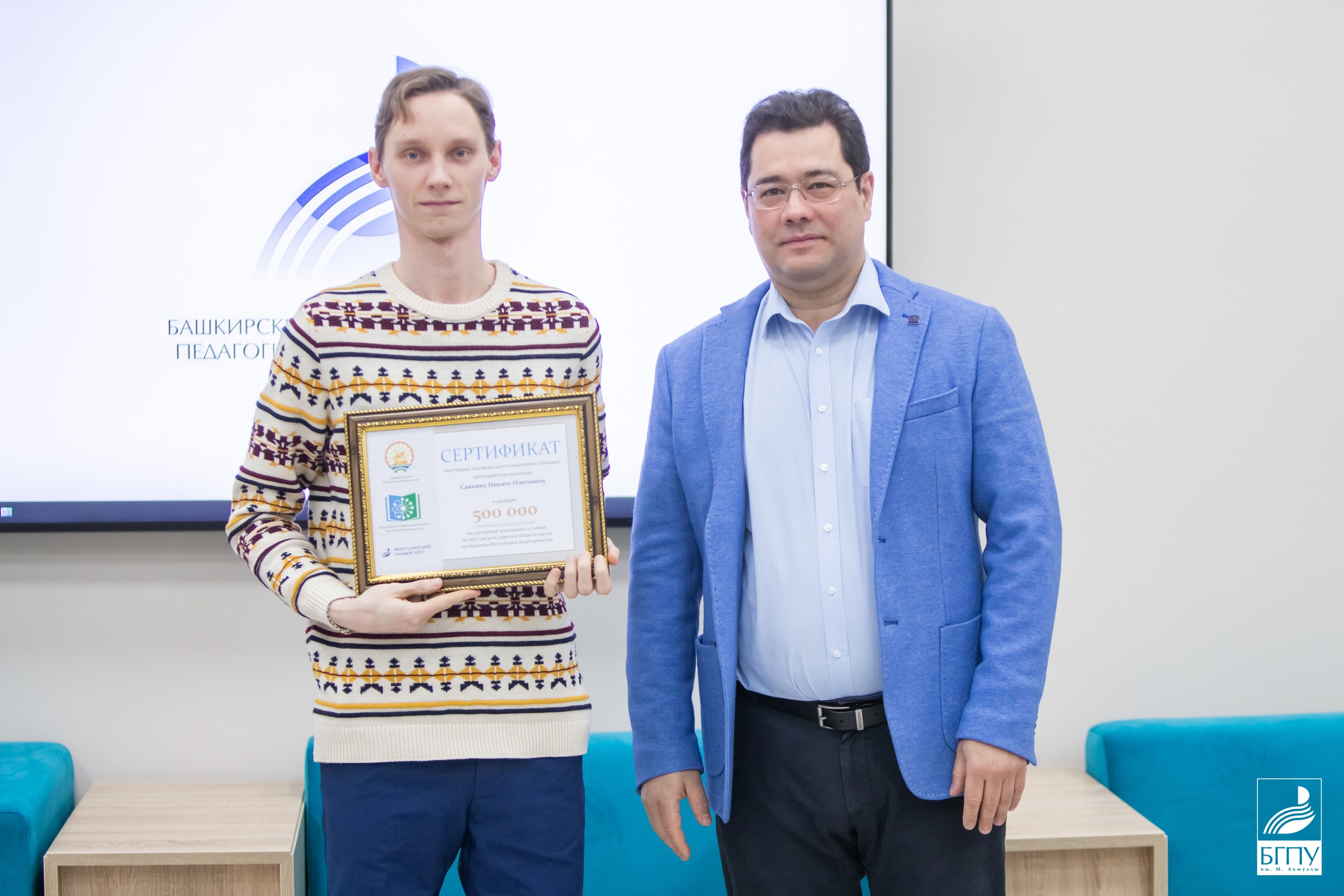 Денежные сертификаты получили старший научный сотрудник БГПУ им. М. Акмуллы Залия Батталова, доценты кафедры теорий и методик начального образования Гульдар Ибрагимова и Наталья Сандалова,  доцент кафедры физики и нанотехнологий Рамис Каримов, доцент кафедры теории и методики физической культуры и спорта Роман Кулешов, а также старший преподаватель кафедры башкирского языка и литературы Айтуган Куланчин. Сертификаты также вручили преподавателям Колледжа БГПУ им. М. Акмуллы Алексею ИвановуТатьяне ВасильевойНиките Санкину и Ильсияр Зайнуллиной.