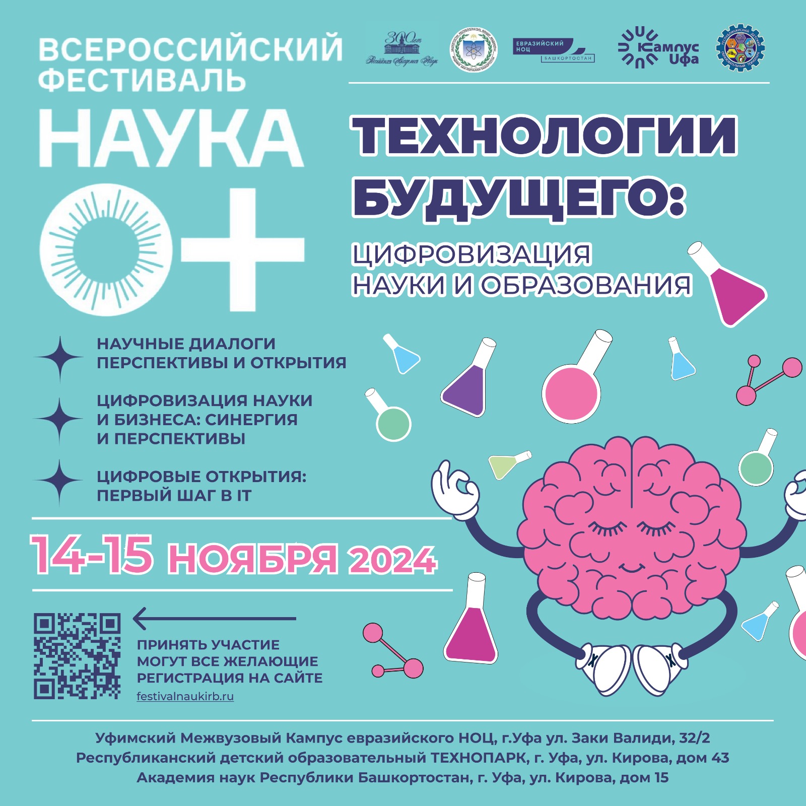 14-15 ноября 2024 года в городе Уфа состоится XIV Всероссийский Фестиваль науки "Наука 0+" «ТЕХНОЛОГИИ БУДУЩЕГО: ЦИФРОВИЗАЦИЯ НАУКИ И ОБРАЗОВАНИЯ»