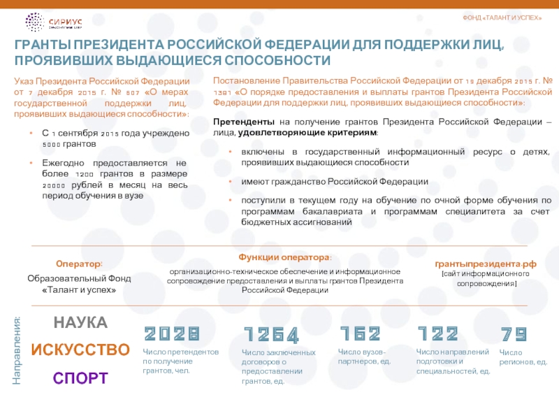 Гранты учреждены соответствии с Указами Президента Российской Федерации от 18 ноября 2019 г. № 565 «О дополнительных мерах государственной поддержки лиц, проявивших выдающиеся способности». Обладателем гранта могут стать студенты  вузов Российской Федерации, которые проявили способности в определенной сфере деятельности – в педагогической, научной (научно-исследовательской), научно-просветительской, инженерно-технической, изобретательской, творческой (или) физкультурно-спортивной деятельности. Учредителями грантов являются Образовательный фонд «Талант и успех», Национальный координационный совет по поддержке молодых талантов  России, Министерство науки и высшего образования РФ, Министерство культуры РФ, Министерство спорта РФ.