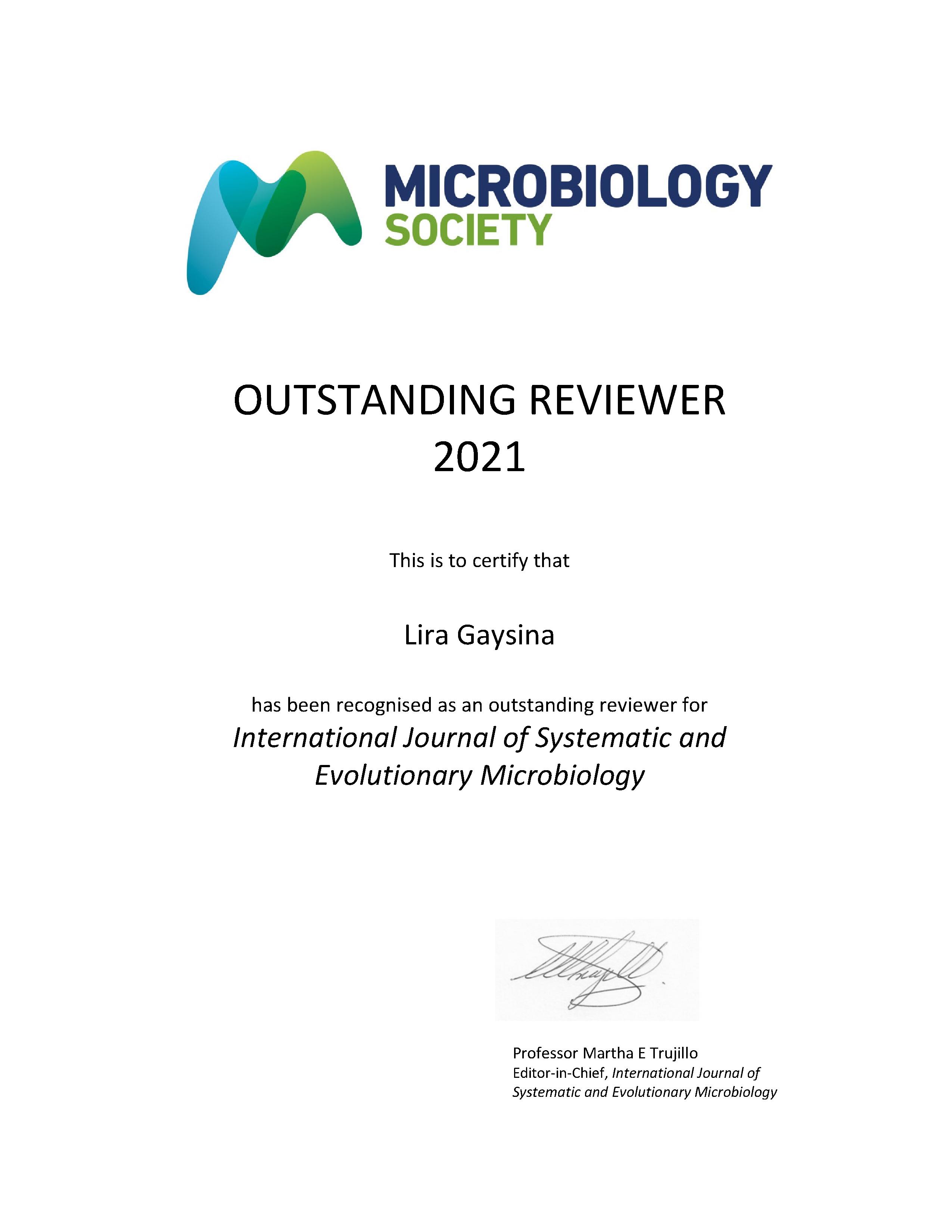 Научный руководитель Центра научно-технической интеграции БГПУ им. М. Акмуллы, доктор биологических наук Лира Альбертовна Гайсина была признана «выдающимся рецензентом» журнала International Journal of Systematic and Evolutionary Microbiology (IJSEM) за 2021 год. IJSEM является одним из наиболее авторитетных изданий в области микробиологии и публикует описания новых таксонов микроорганизмов. Выдающимися рецензентами признаются ученые, представляющие своевременные и объективные рецензии, позволяющие повысить качество публикуемых журналом статей. Необходимо отметить, что качественное рецензирование является необходимым условием развития научных исследований. Существует специальный этический кодекс рецензента, обеспечивающий беспристрастность оценок и конструктивность критических замечаний. Рецензент не получает вознаграждения на свою работу, а рецензирование расценивается как  вклад в развитие научных знаний и технического прогресса.