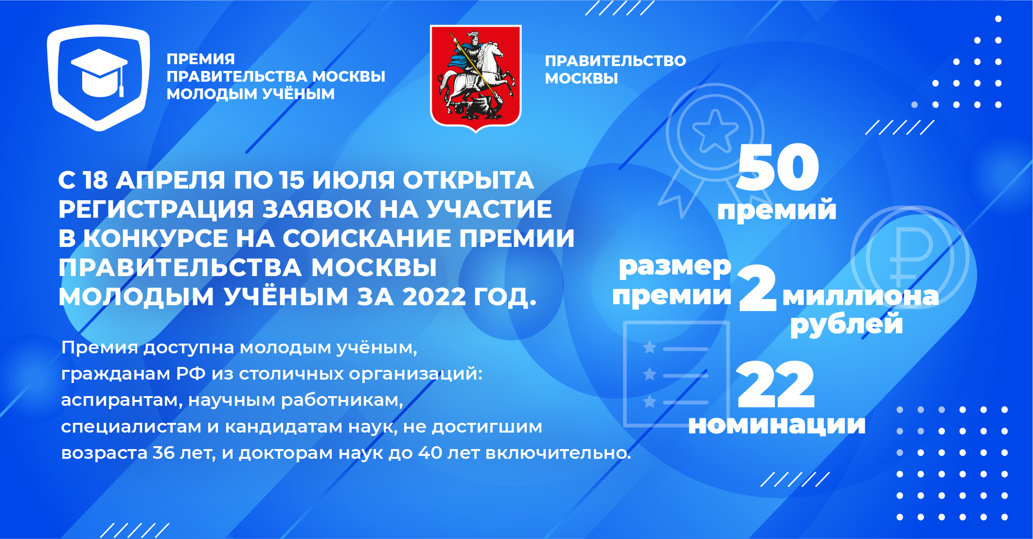 С 18 апреля по 15 июля 2022 года открыта регистрация заявок на конкурс на соискание премии Правительства Москвы молодым учёным за 2022 год. Победителям присуждаются премии в размере 2 млн. рублей каждая, а также вручаются дипломы лауреатов.