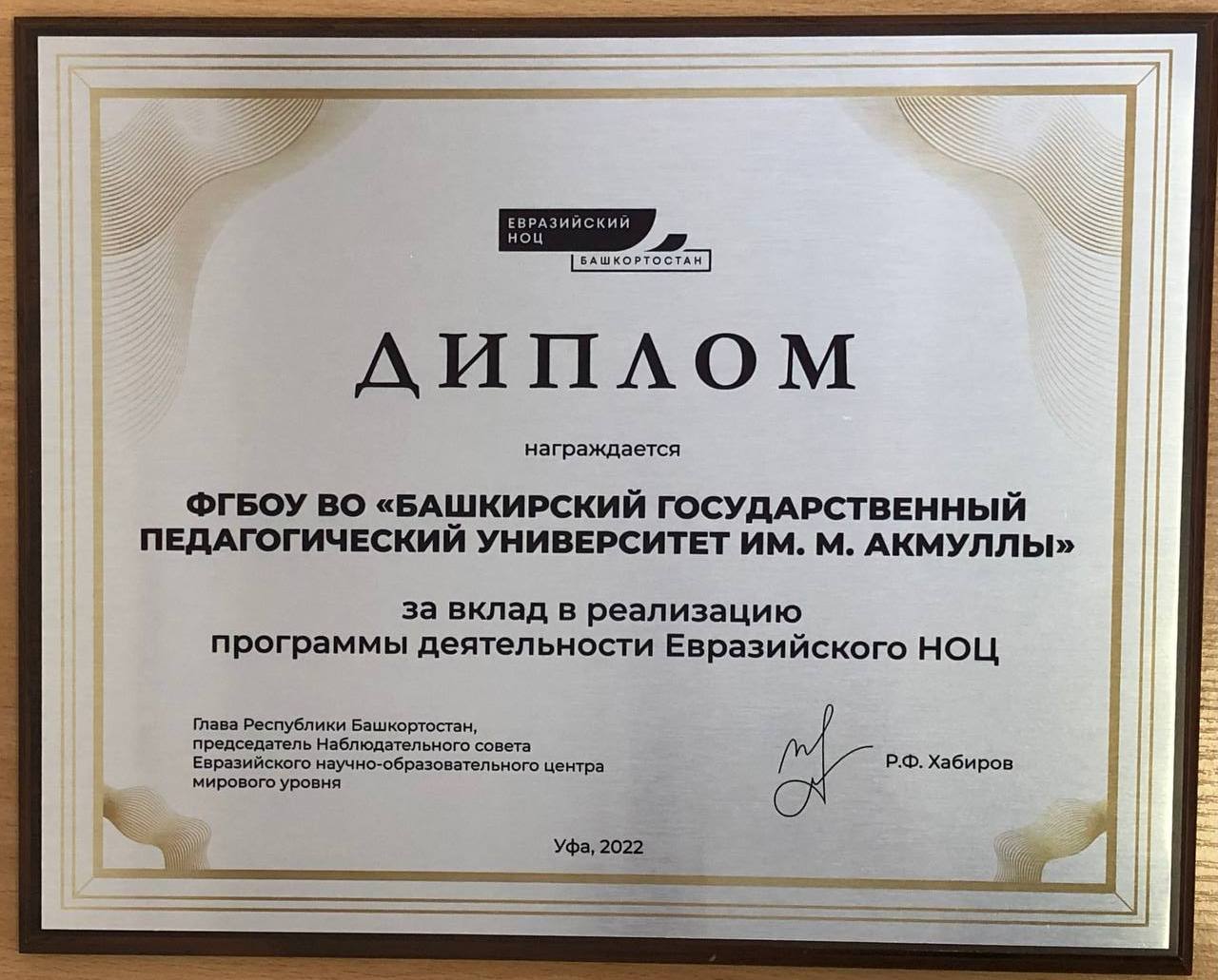 По итогам БГПУ им. М. Акмуллы отмечен премией за вклад в реализацию программы деятельности Евразийского НОЦ. Диплом и статуэтку получил проректор по цифровому развитию и научной деятельности Аскар Фазлыев.