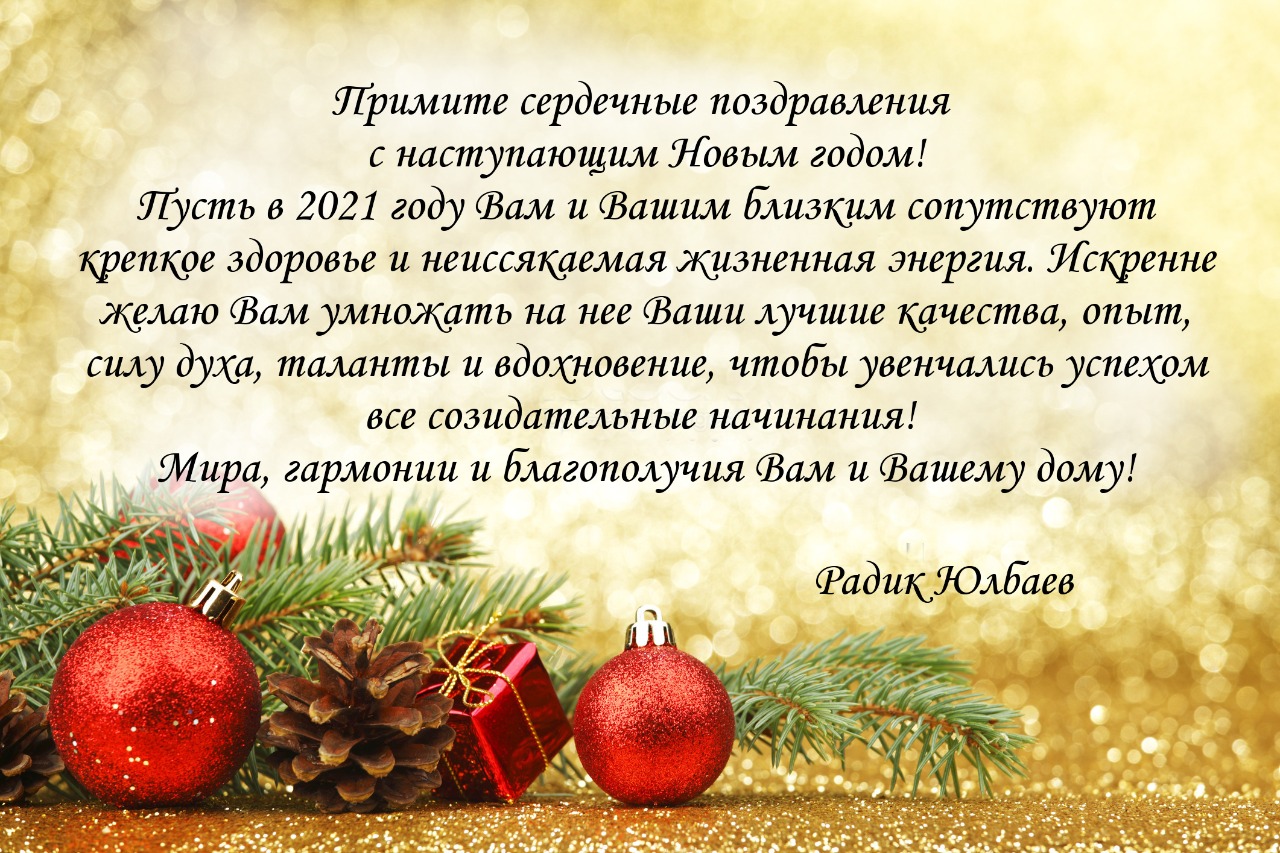 Примите сердечные поздравления с наступающим Новым годом! Пусть  в 2021 году Вам и Вашим близким сопутствуют крепкое здоровье и неиссякаемая жизненная энергия. Искренне желаю Вам умножать на нее Ваши лучшие качества, опыт, силу духа, таланты и вдохновение, чтобы увенчались успехом все созидательные начинания! Мира, гармонии и благополучия Вам и Вашему дому!