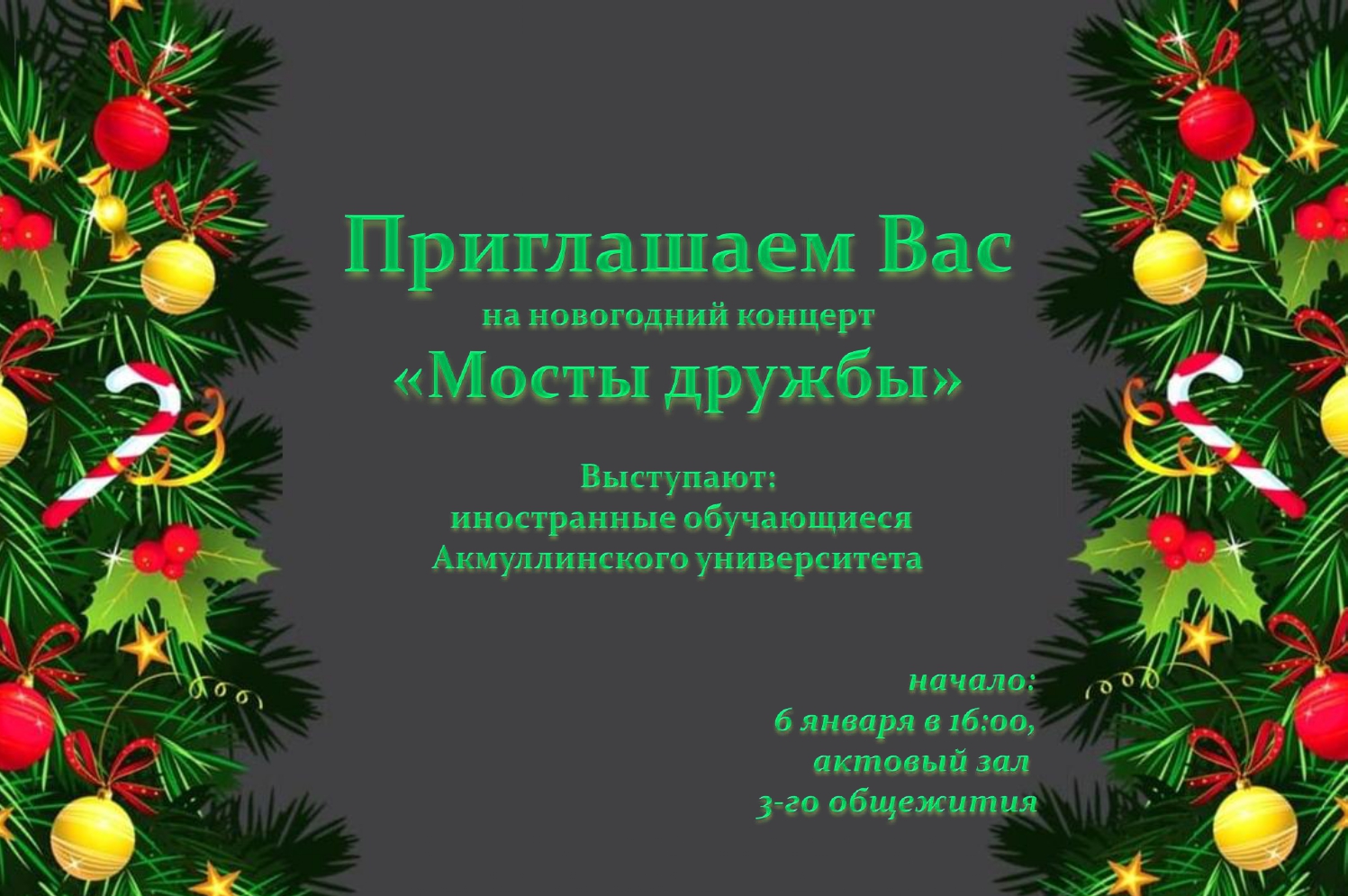 6 января в 16:00 в актовом зале 3 общежития БГПУ им. М.Акмуллы (ул. Свердлова,55) состоится праздничный новогодний концерт «Мосты дружбы» с участием иностранных обучающихся нашего университета.