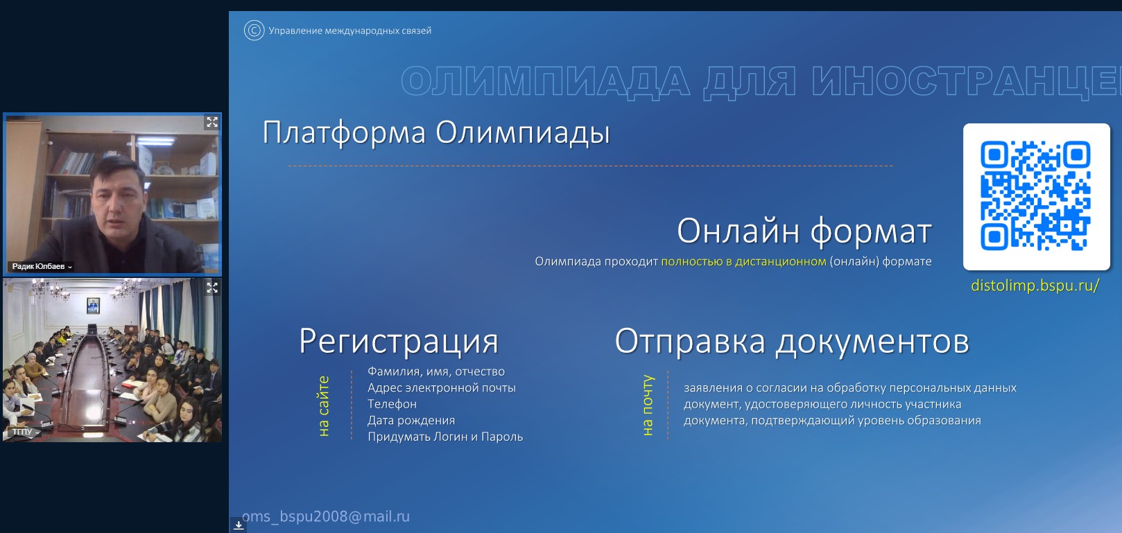 Начальник УМС Радик Юлбаев рассказал студентам старших курсов ТГПУ им. С.Айни о возможности принять участие в Акмуллинской олимпиаде для иностранных абитуриентов.