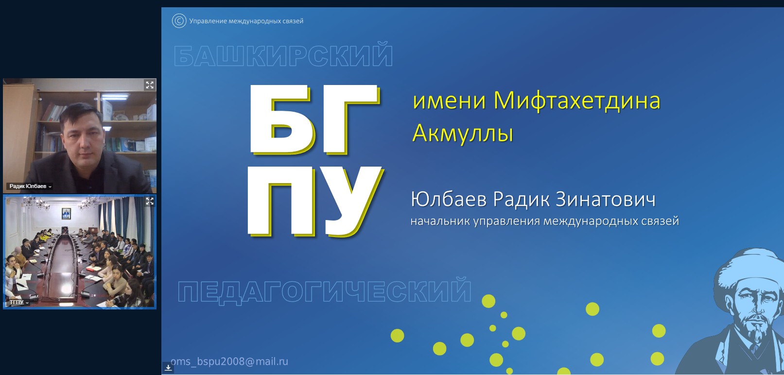 1 февраля 2023 года на базе БГПУ им. М.Акмуллы состоялась международная онлайн-встреча с сотрудниками и студентами Таджикского государственного педагогического университета им.С.Айни. Организатором выступило управление международных связей Башгоспедуниверситета.