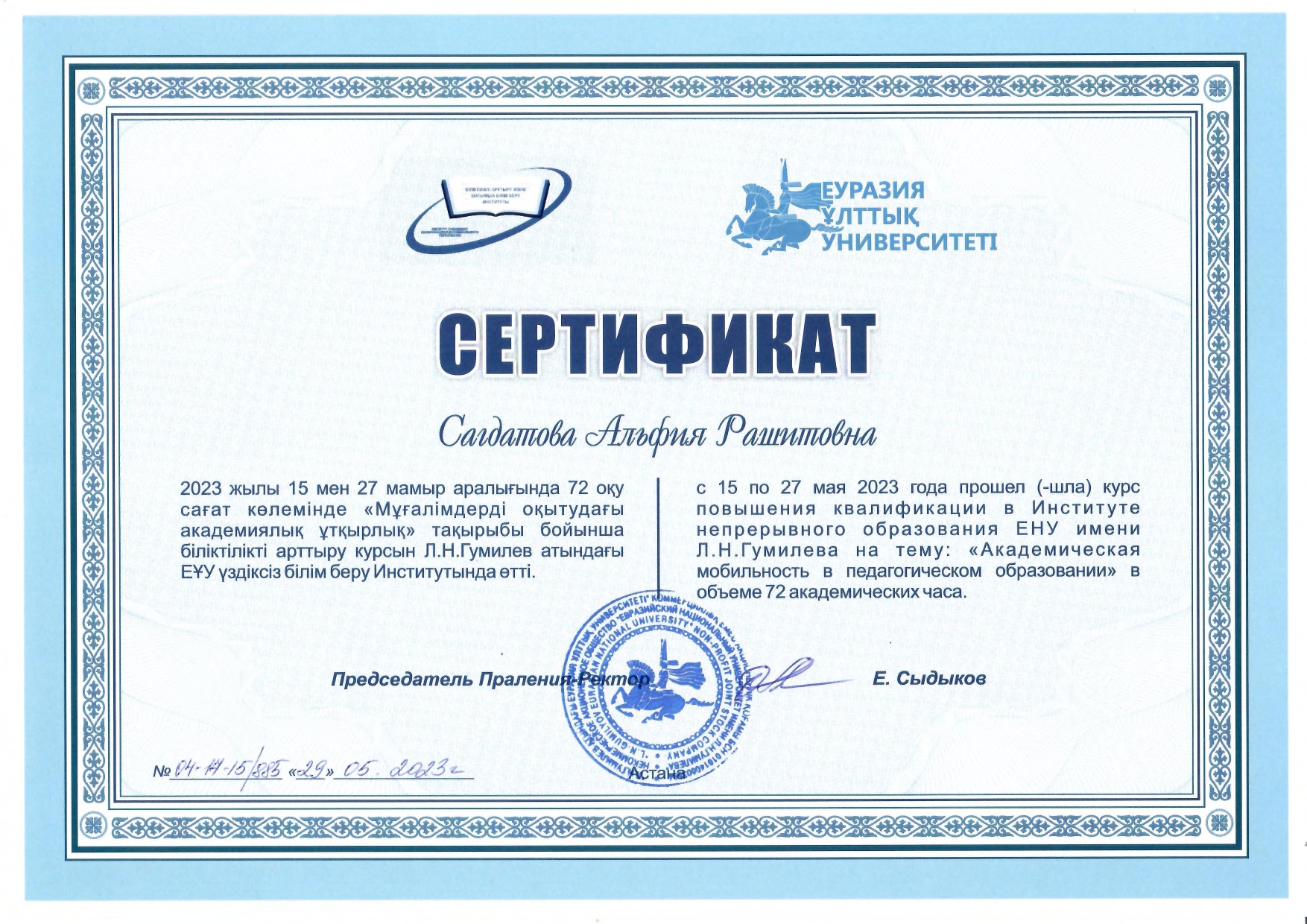 С 15 по 27 мая заведующий сектором внеучебной и визово-регистрационной работы Управления международных связей Акмуллинского университета, аспирант 1 года обучения Института педагогики Альфия Сагдатова посетила Евразийский национальный университет им. Л.Н. Гумилева в городе Астана с целью прохождения научно-исследовательской стажировки в рамках гранта Главы Республики Башкортостан на поддержку молодых научно-педагогических работников. Руководителем программы принимающей стороны выступила психолог, доктор PhD в области педагогики и психологии Аубакирова Сауле Джамбуловна. В рамках программы Альфия Сагдатова также прошла индивидуальный курс повышения квалификации в Институте непрерывного образования ЕНУ им.Л.Н. Гумилева на тему «Академическая мобильность в педагогическом образовании».