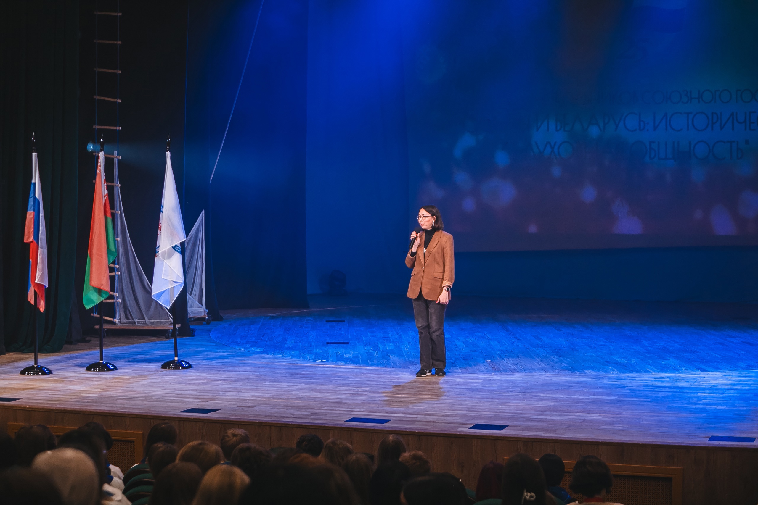 Представитель Министерства образования Республики Беларусь Анжела Кудоярова рассказала о том, как 20 лет назад в Гомеле начиналась Олимпиада школьников Союзного государства, и зачитала приветствие участникам олимпиады от имени министра образования Республики Беларусь Андрея Иванца.