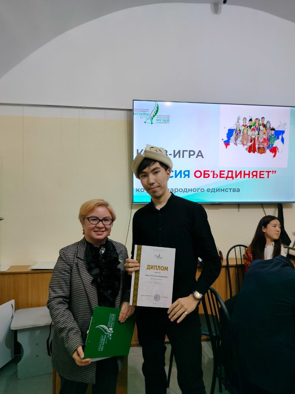 Помимо этого, в музее был организован интеллектуальный квиз «Россия объединяет», который стал не только площадкой для интеллектуальной борьбы, но и шансом  для студентов разных учебных заведений познакомиться друг с другом с, обменяться знаниями. В результате напряженной игры команда «Потомки Акмуллы» завоевала второе место, что является ярким подтверждением интеллектуальных способностей и упорства наших студентов. Участие в подобных  мероприятиях создает атмосферу культурного обмена и мотивирует к дальнейшему развитию.