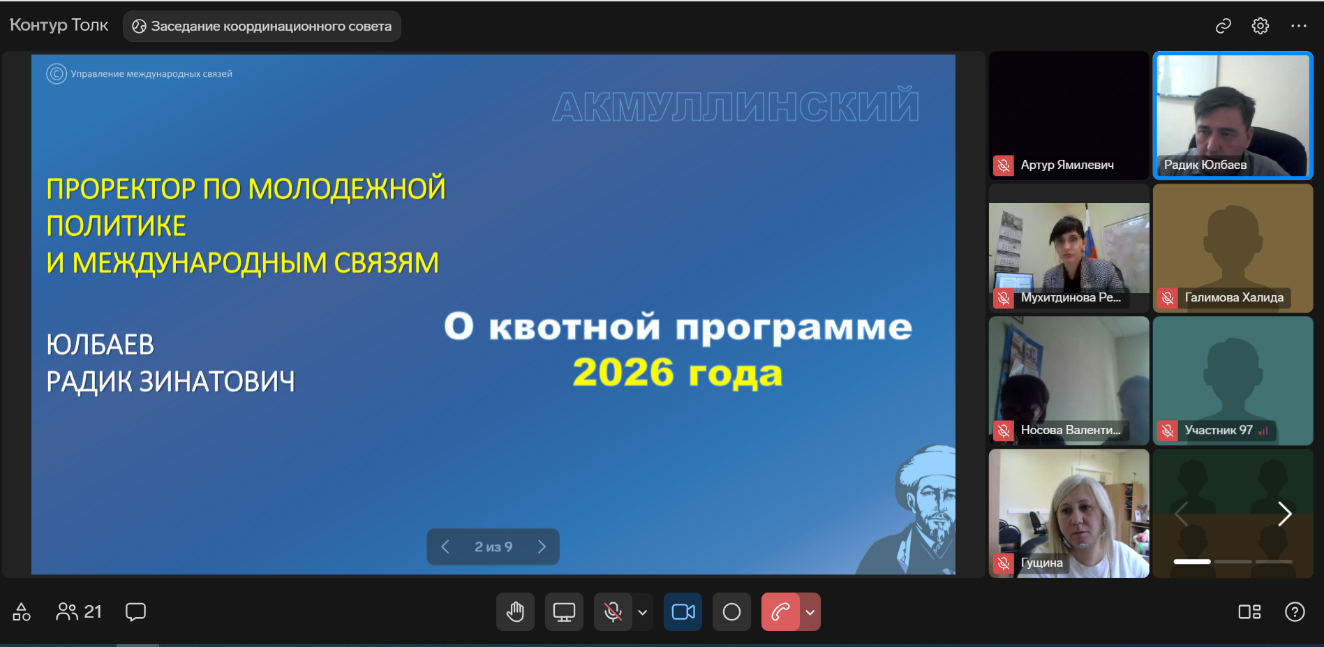 Очередное заседание Координационного совета по развитию международной деятельности прошло в продуктивном ключе, по итогам собрания факультетам и институтам было поручено продолжать усердную работу по сопровождению иностранных обучающихся и их адаптации к жизни Акмуллинского университета.