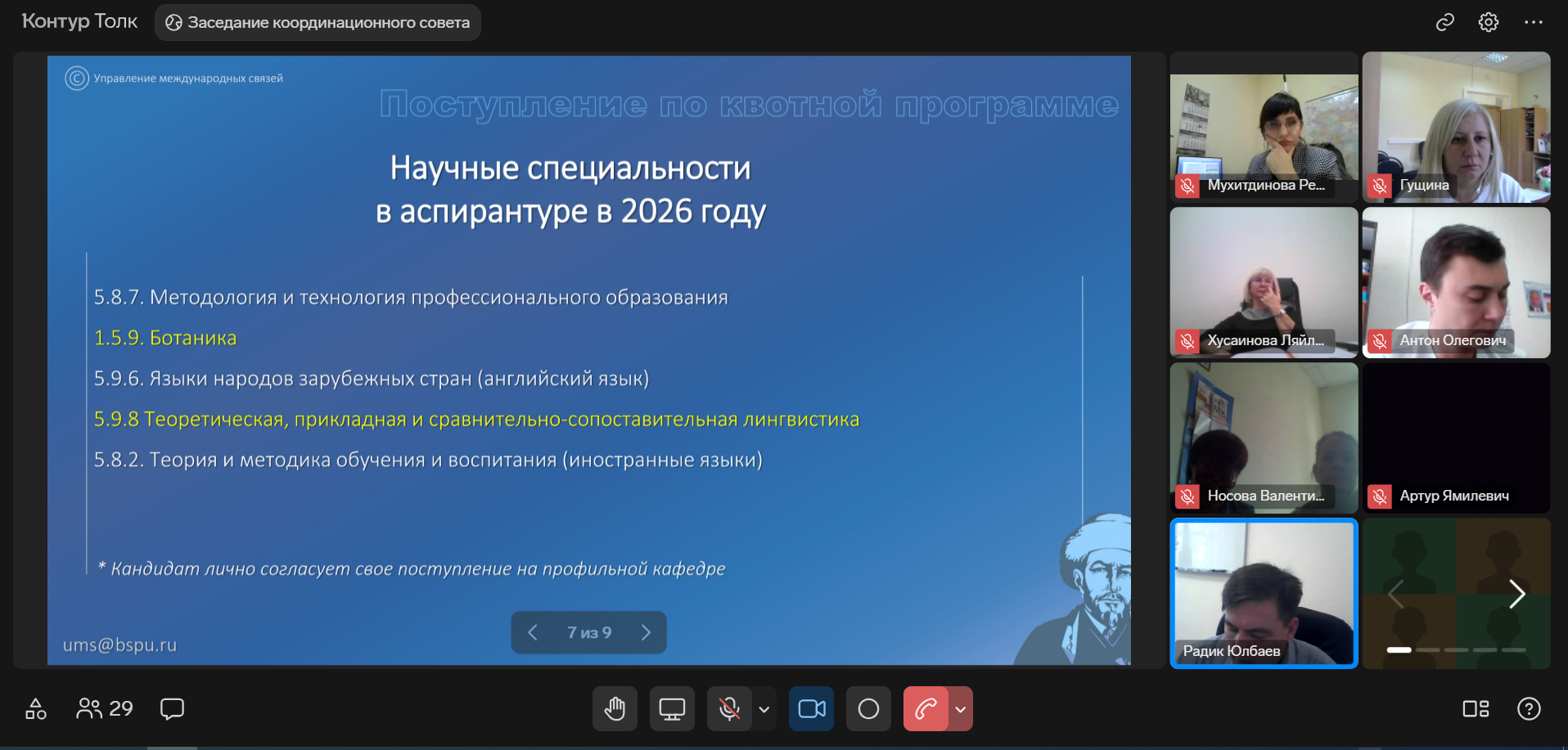 Повестка собрания была посвящена актуальным вопросам. В своем выступлении Радик Юлбаев рассказал о поступлении в 2026 году кандидатов из числа выпускников БГПУ им. М.Акмуллы  и иностранных университетов на обучение в БГПУ им. М.Акмуллы в рамках квоты Правительства РФ, деталях регистрации на портале https://education-in-russia.com/ и сроках подачи документов, призвав ответственных лиц от факультетов провести работу с обучающимися выпускных курсов.