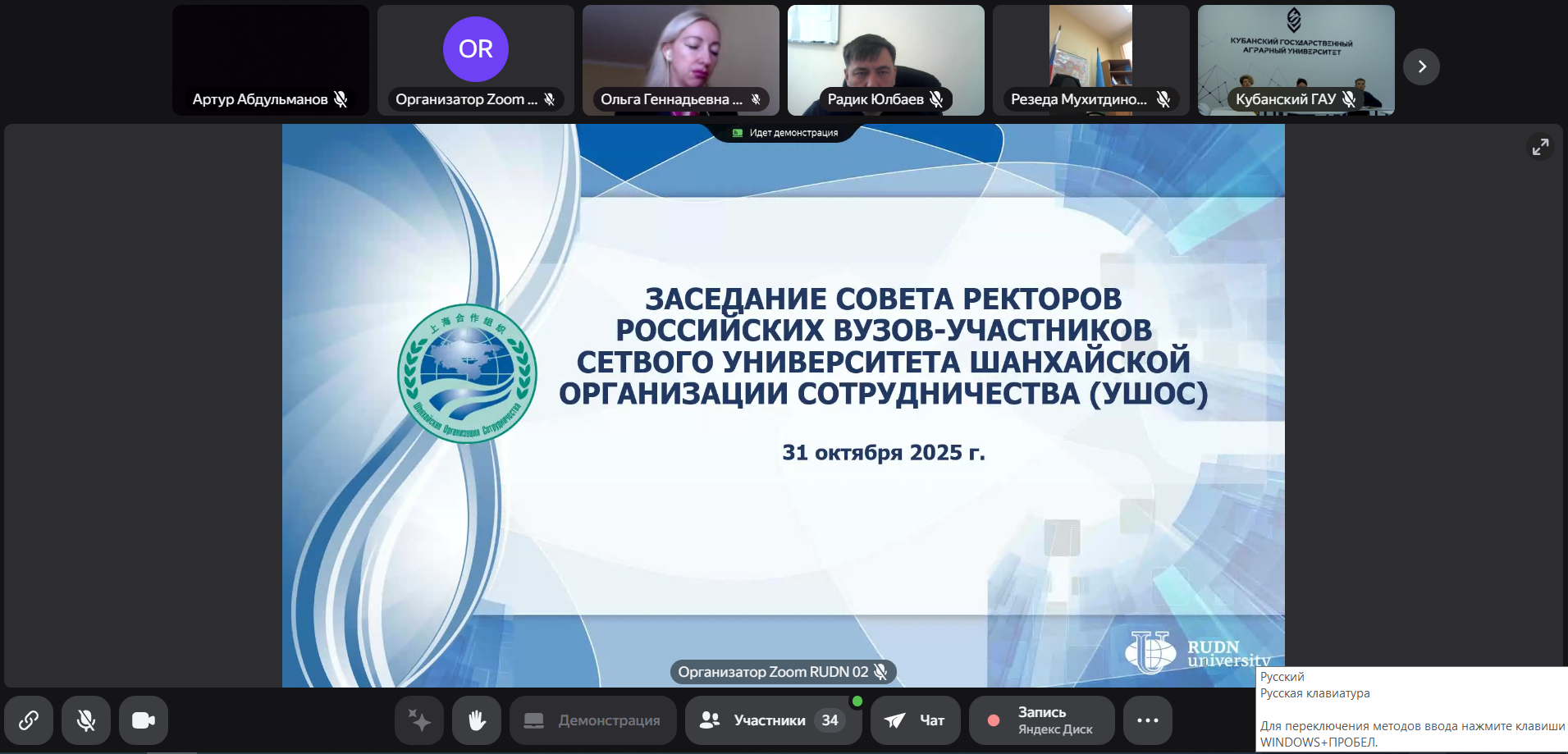 31 октября на базе РУДН им. П.Лумумбы состоялось очередное заседание российской части национального ректората Университета ШОС. Мероприятие было посвящено обсуждению координации общих усилий и выработки эффективной решений для дальнейшей работы в рамках УШОС.