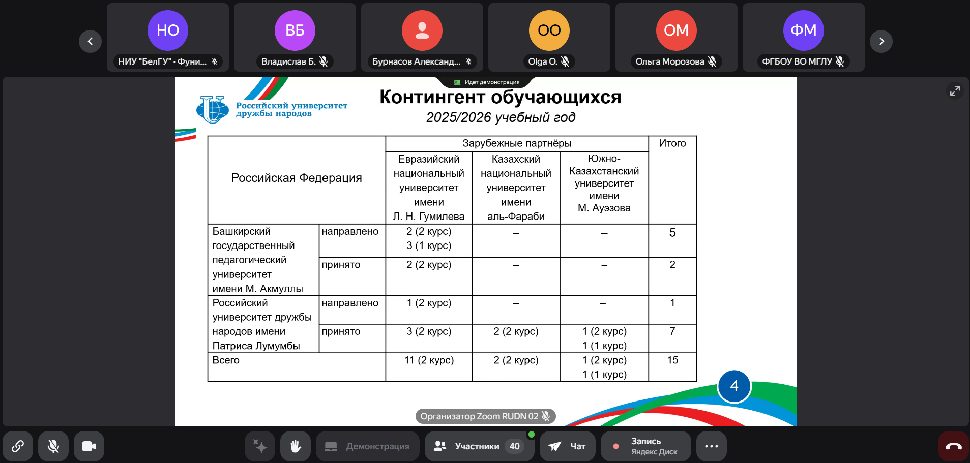 В ходе заседания заслушаны доклады кураторов основных направлений двудипломного обучения: Педагогика, Энергетика, Экология, Экономика.  Примечательно, что лишь 2 университета были отмечены в рамках работы по направлению «Педагогика» –  РУДН им. П.Лумумбы и Акмуллинский университет. Это подчеркивает приверженность БГПУ им. М.Акмуллы заложенным принципам Университета ШОС и демонстрирует эффективность стабильно проводимой работы в рамках организации.