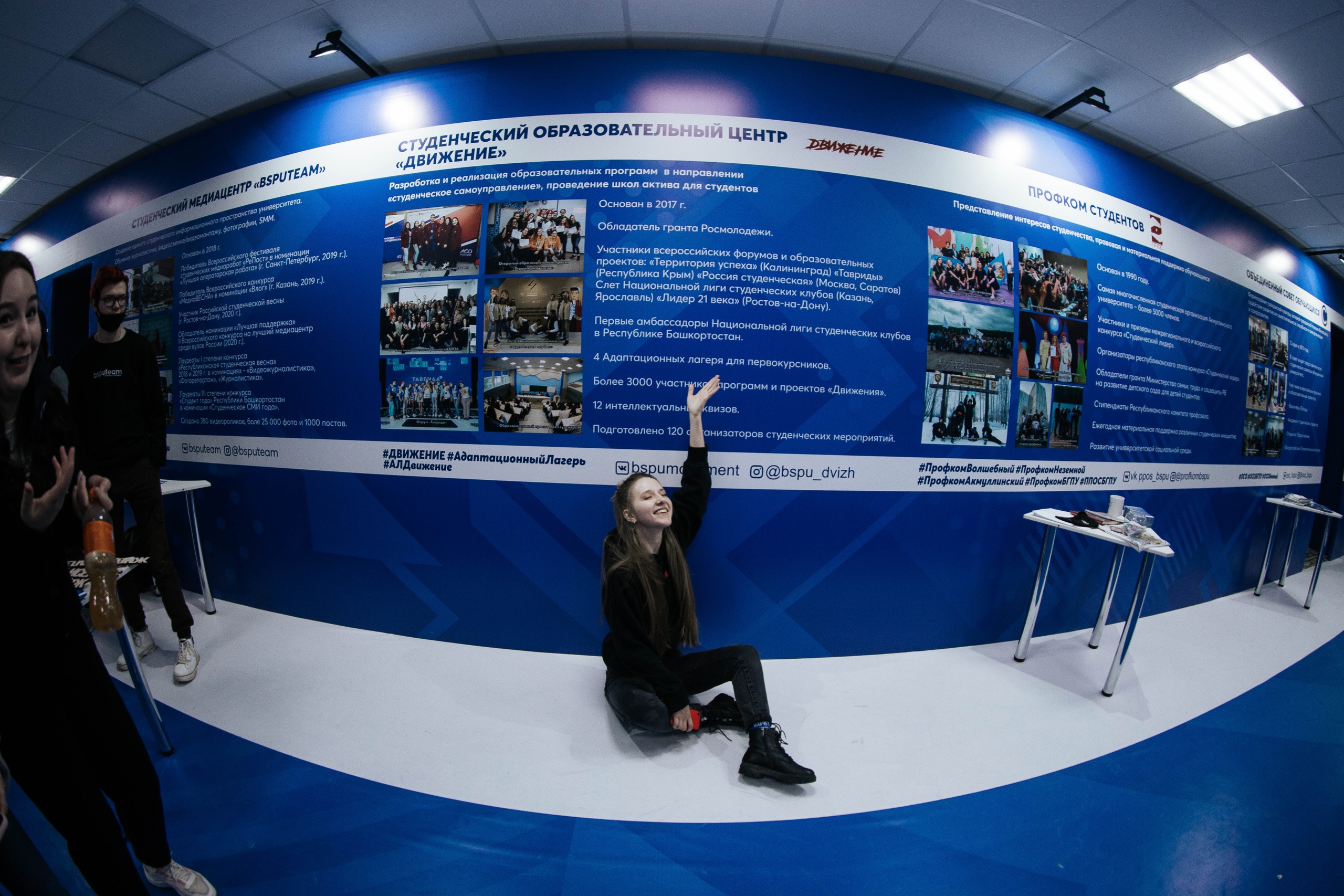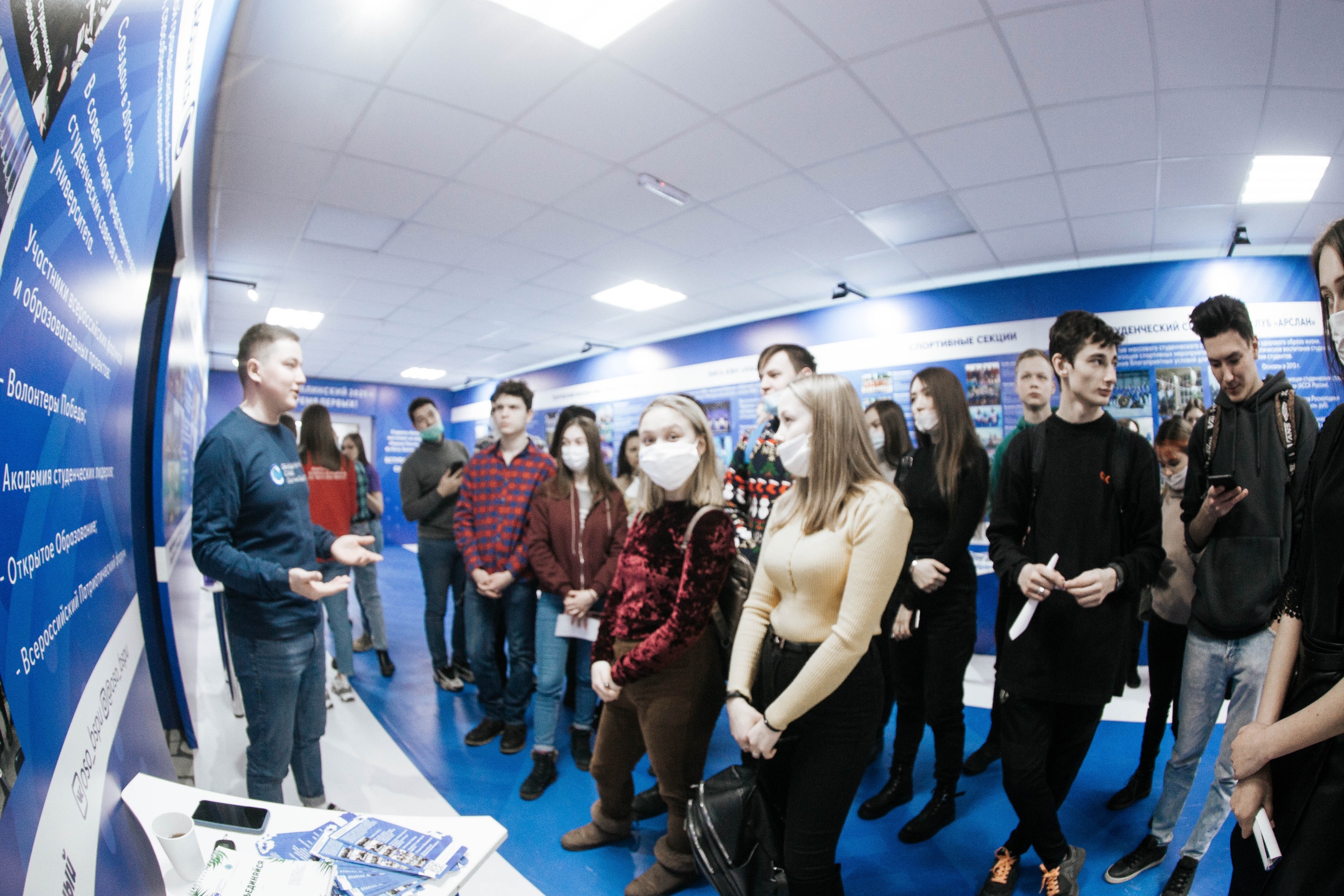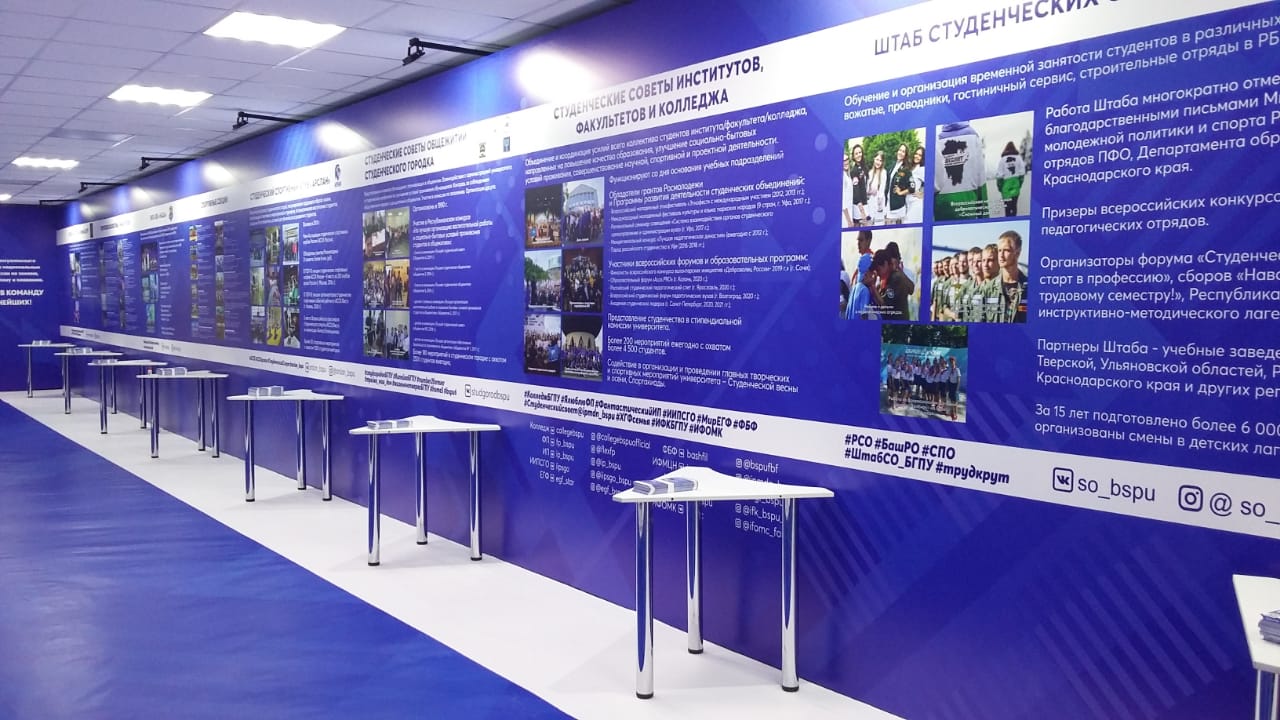 В холле второго корпуса расположилась выставка, где представлены все студенческие объединения: творческие коллективы, спортивные секции, студенческий спортивный клуб "Арслан", креативный центр, волонтерский центр с блоком социального проектирования и штабом здоровья, студенческие советы институтов/факультетов и студенческого городка, студенческое научное общество, комитет по качеству образования, штаб студенческих отрядов, студенческий клуб интеллектуальных игр, студенческий медиацентр, студенческий образовательный центр "Движение", профком студентов, КВН-движение университета.