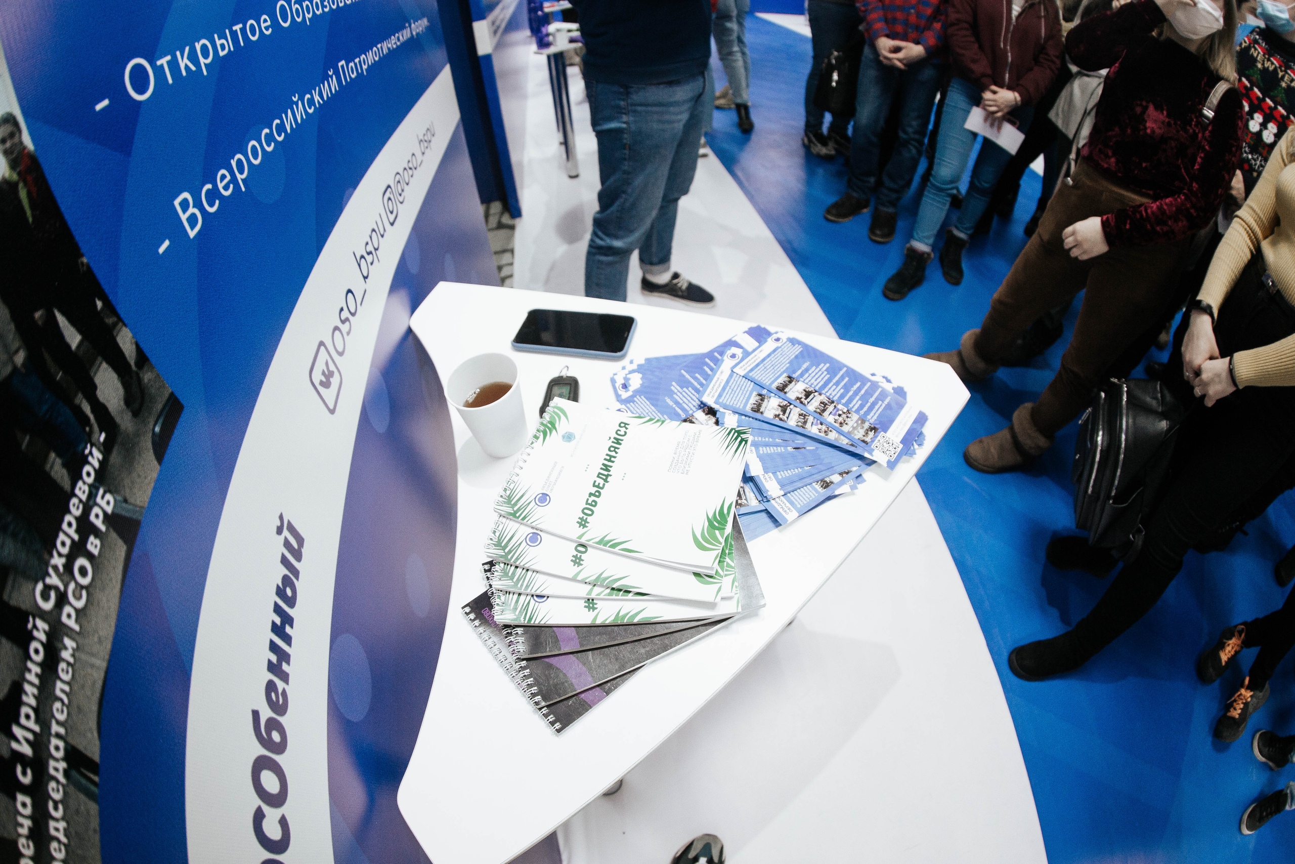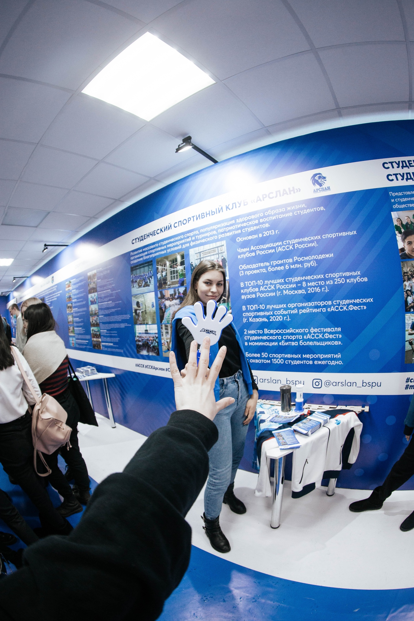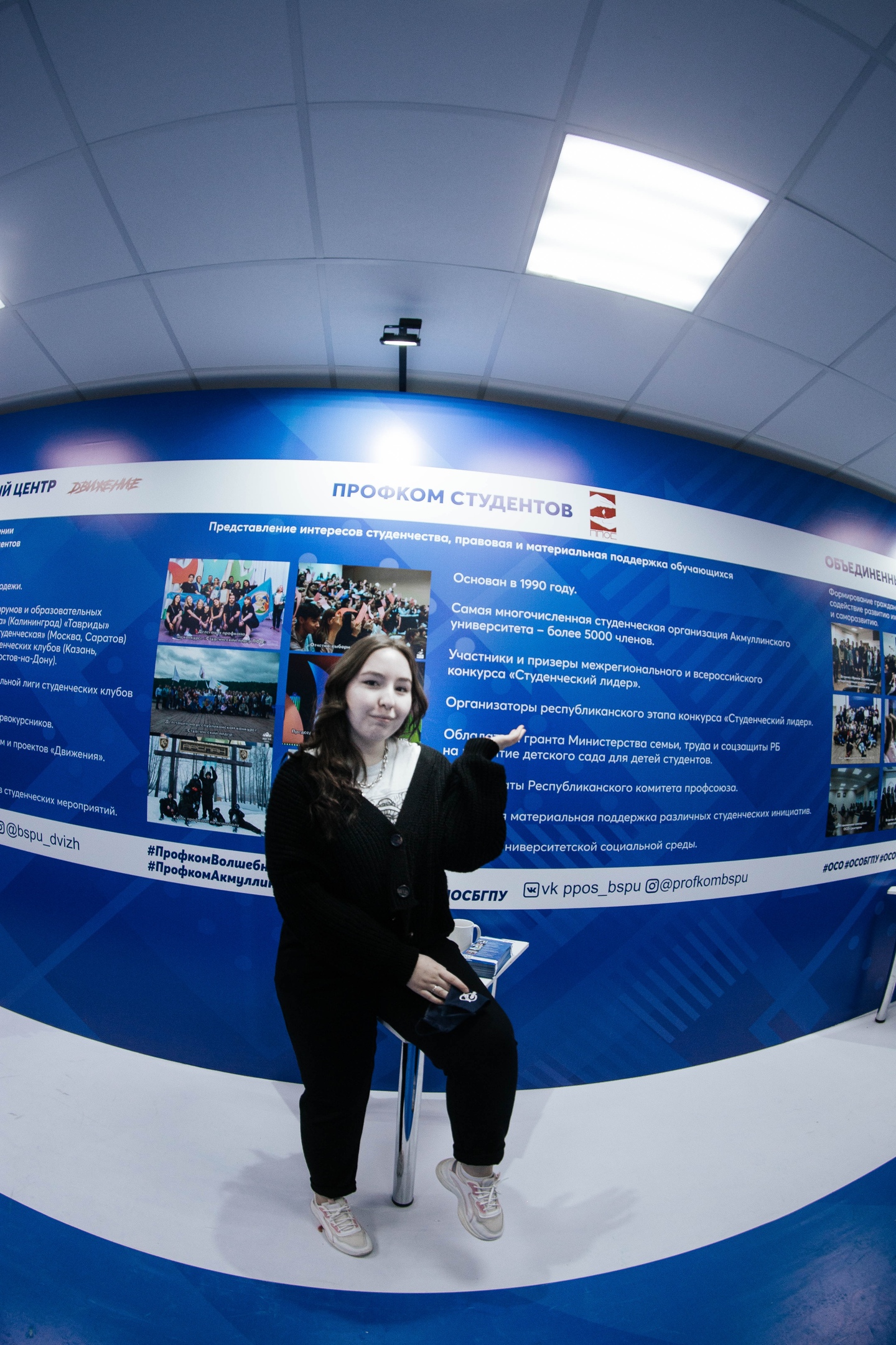 В холле второго корпуса расположилась выставка, где представлены все студенческие объединения: творческие коллективы, спортивные секции, студенческий спортивный клуб "Арслан", креативный центр, волонтерский центр с блоком социального проектирования и штабом здоровья, студенческие советы институтов/факультетов и студенческого городка, студенческое научное общество, комитет по качеству образования, штаб студенческих отрядов, студенческий клуб интеллектуальных игр, студенческий медиацентр, студенческий образовательный центр "Движение", профком студентов, КВН-движение университета.