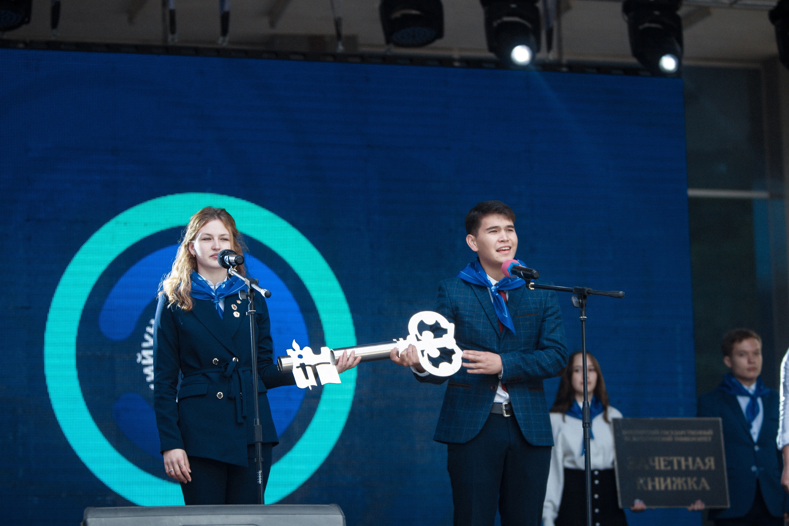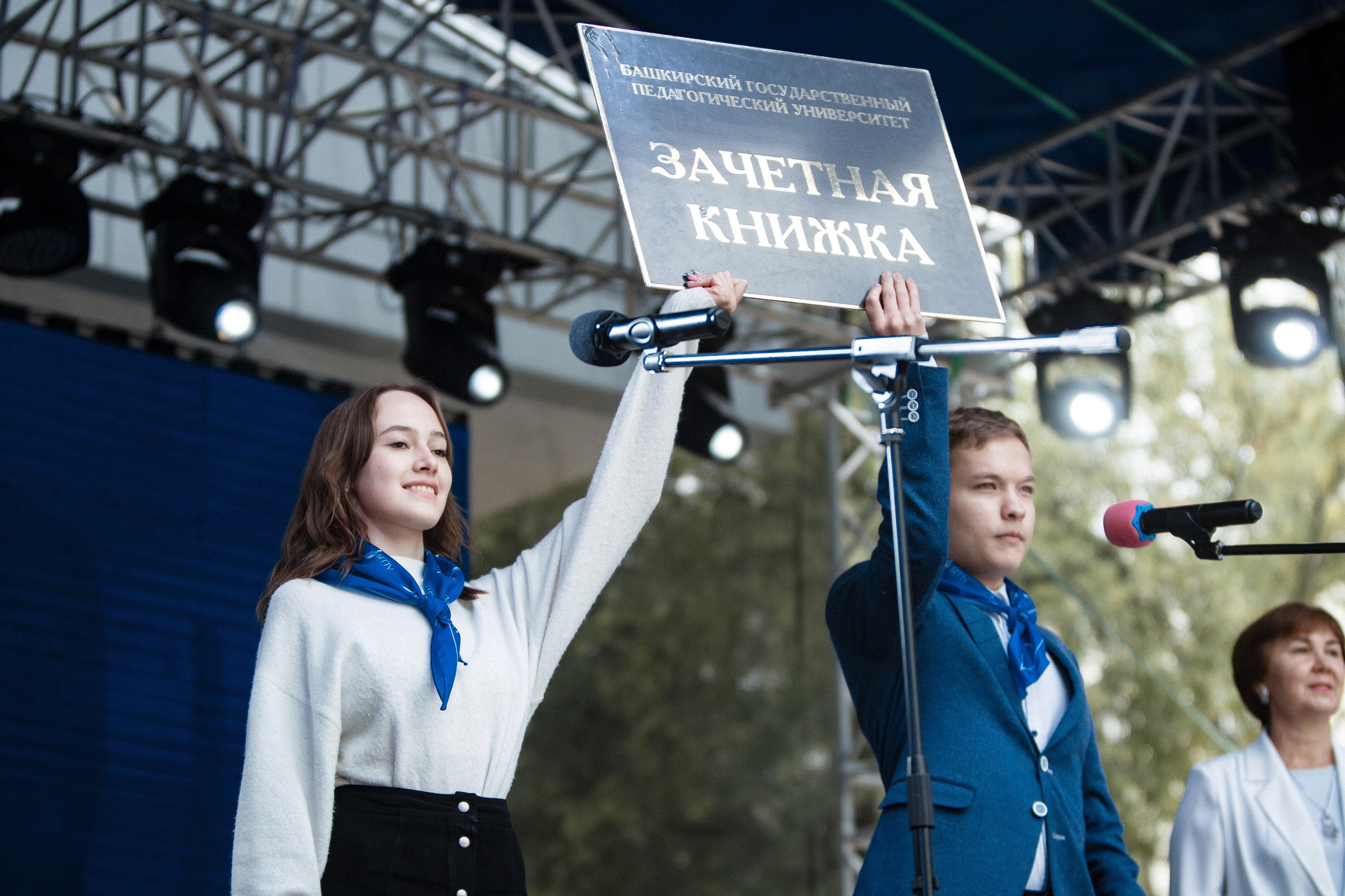 Конечно, на празднике были соблюдены все традиции Акмуллинского университета. Первокурсники получили из рук своих наставников символические студенческий билет, зачетную книжку и ключ к знаниям, им повязали синие атласные платки с эмблемой университета. Из рук студентов старших курсов первокурсники получили флаги факультетов и принесли клятву студентов БГПУ.
