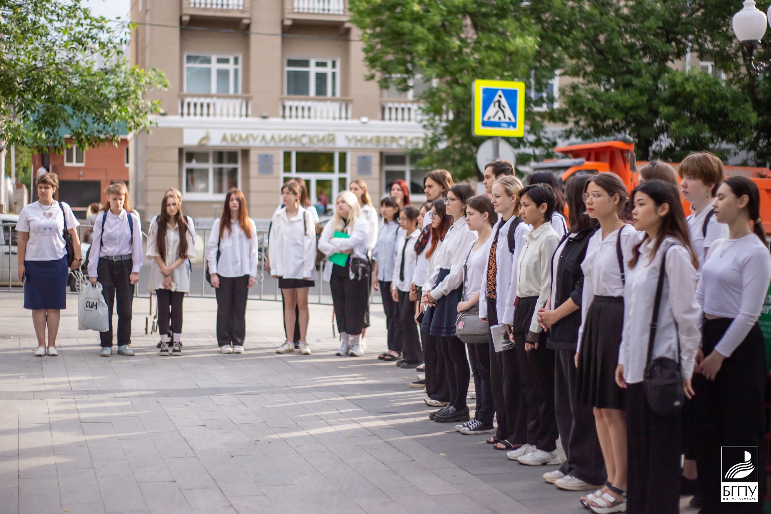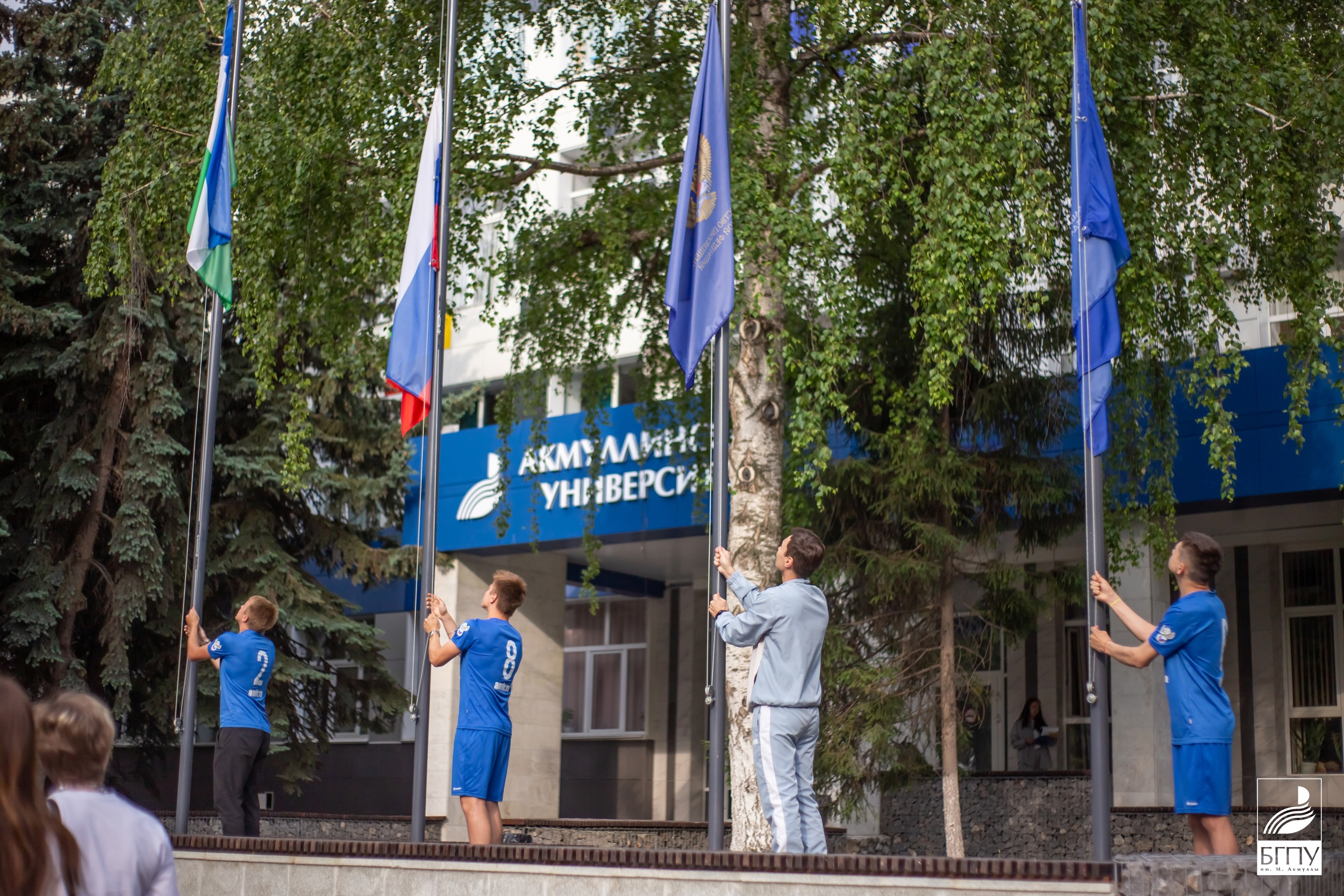 Почетное право поднять флаги предоставили команде Акмуллинского колледжа – призерам Всероссийского проекта «Мини-футбол – в вузы», проходившего с 10 по 26 мая в Нижегородской области. В финале Серебряной и Бронзовой лиг футболисты Колледжа БГПУ обыграли Гатчинский педагогический колледж со счетом 4:3.