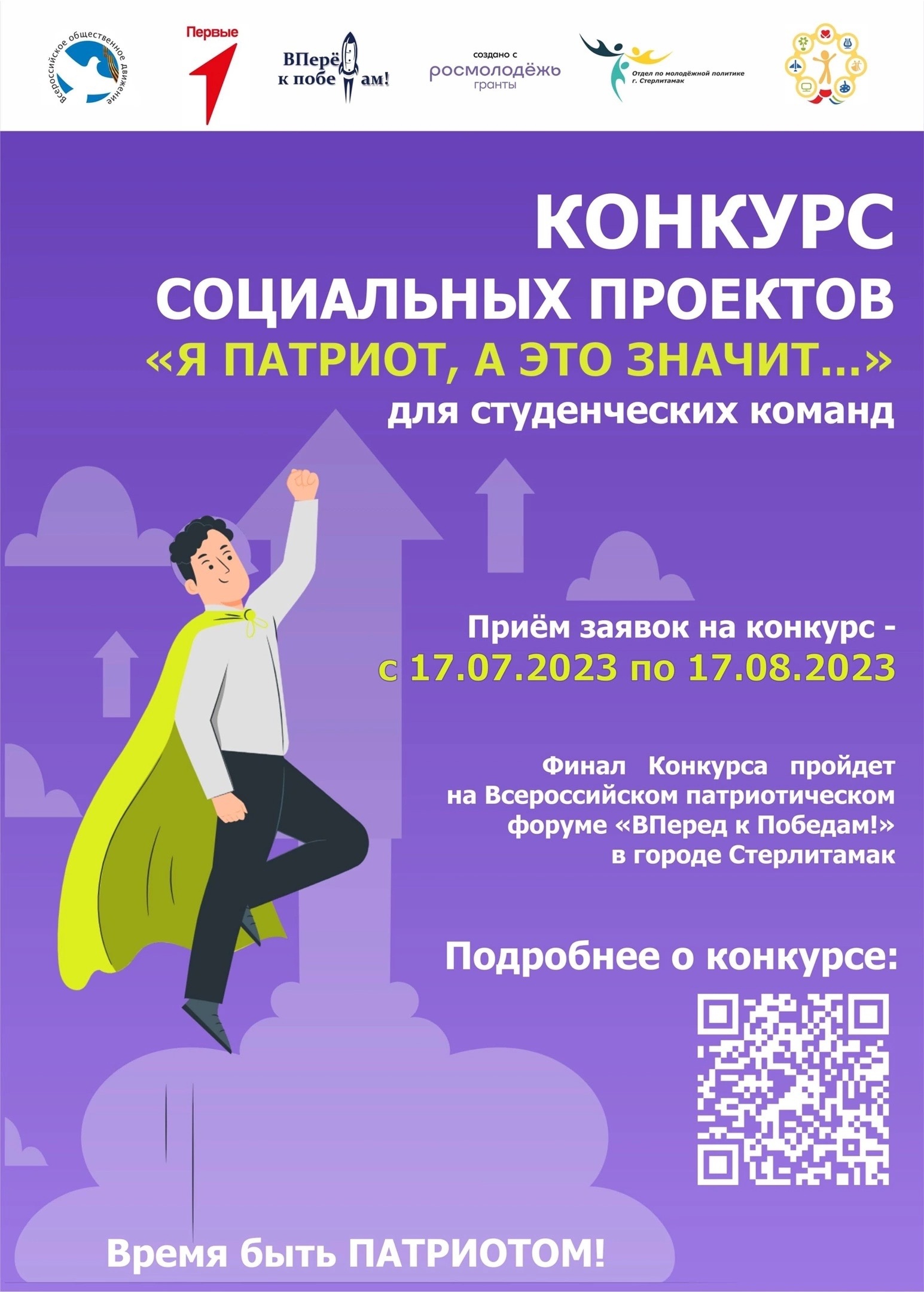 Муниципальное отделение ГО г. Стерлитамак «Движение первых» РБ запустил отбор на Всероссийский патриотический форум «ВПеред к Победам!», который состоится в сентябре 2023 года. Участниками станут финалисты конкурса социальных проектов «Я патриот! А это значит…».