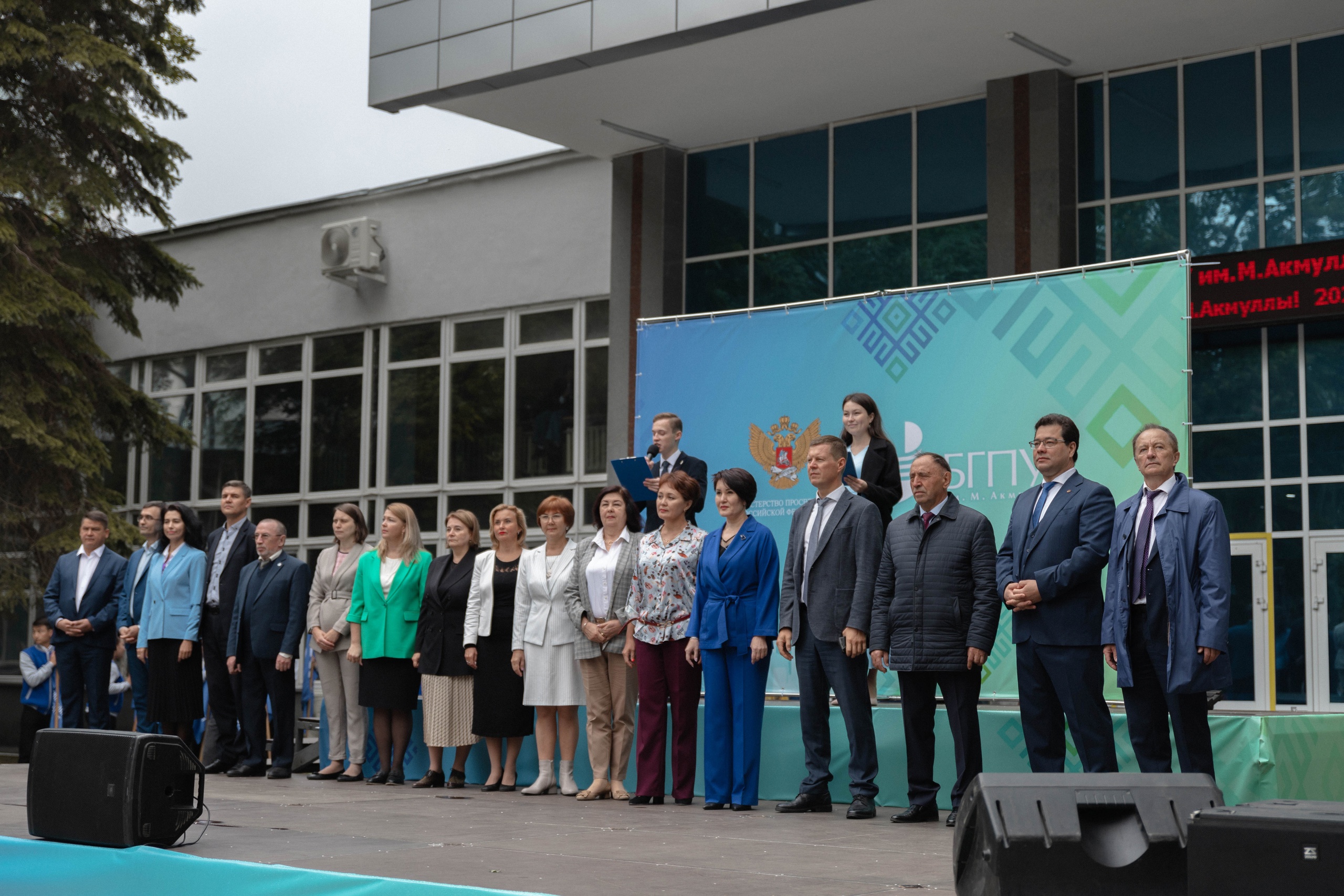 Праздничное мероприятие началось с торжественного выноса государственного флага России, флага Республики Башкортостан и знамени Башгоспедуниверситета.
