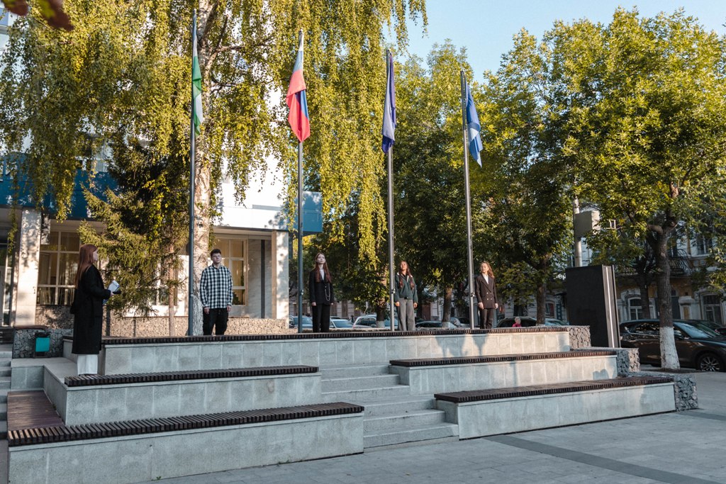 Новая учебная неделя началась в Акмуллинском университете с церемонии поднятия флагов. Почетное право поднять государственный флаг России, флаги Башкортостана, Минпросвещения и БГПУ имени Акмуллы было предоставлено первокурсникам Института филологического образования и межкультурных коммуникаций.