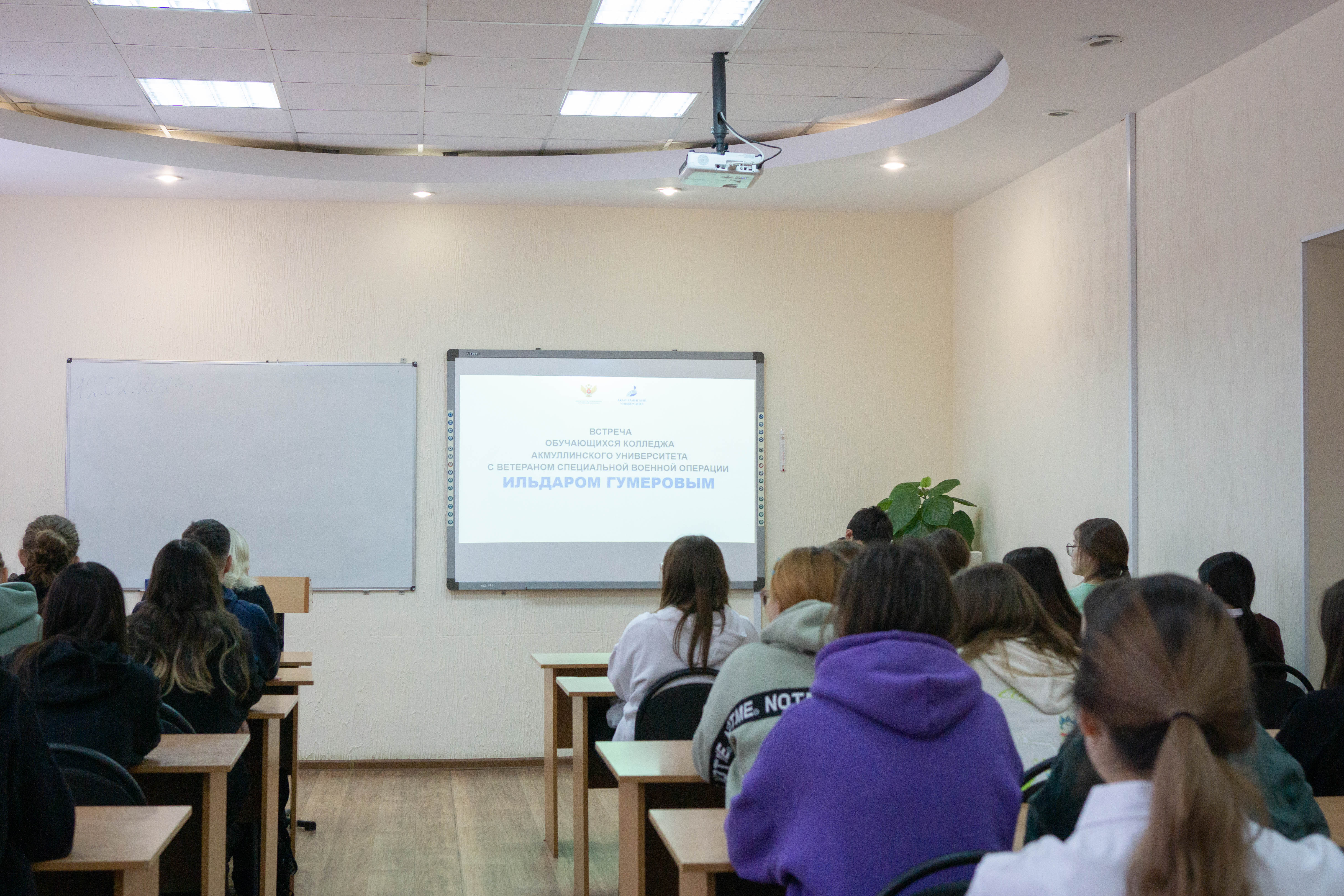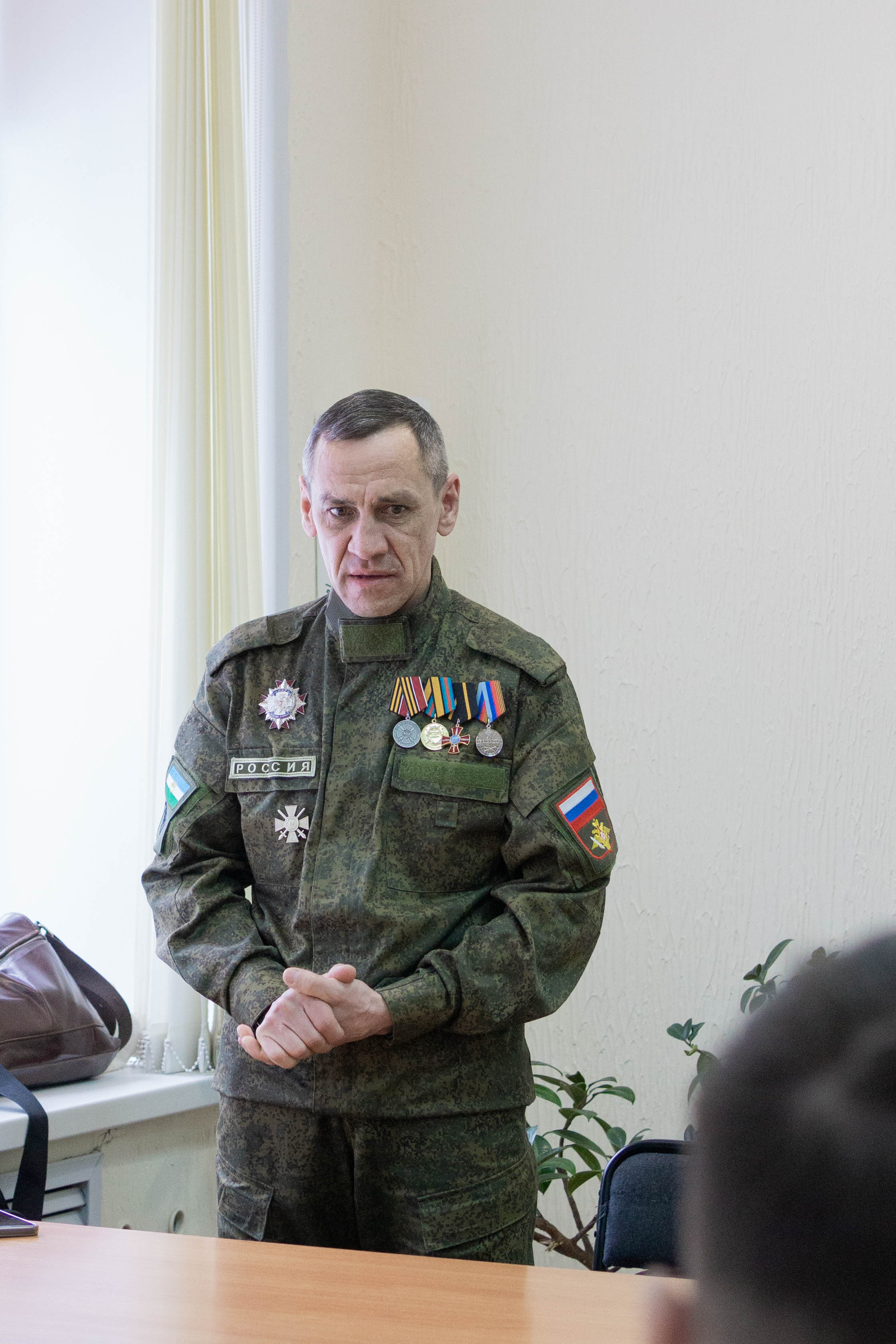 12 февраля в Колледже Акмуллинского университета состоялась встреча с заместителем председателя военно-патриотического центра «Вымпел» в Республике Башкортостан, ветераном боевых действий, участником специальной военной операции, экс-командиром 7-го добровольческого батальона «БАРС» Ильдаром Гумеровым.