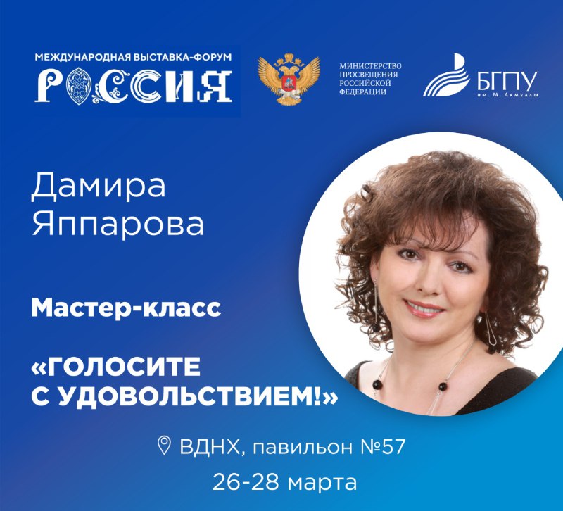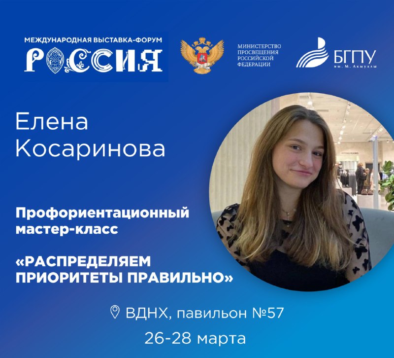 С 26 по 28 марта БГПУ имени М. Акмуллы организует свою программу в павильоне №57 (Исторический парк «Россия – Моя история») на ВДНХ. В течение трех дней преподаватели и студенты проведут ряд мастер-классов и лекций для посетителей экспозиции Минпросвещения России.