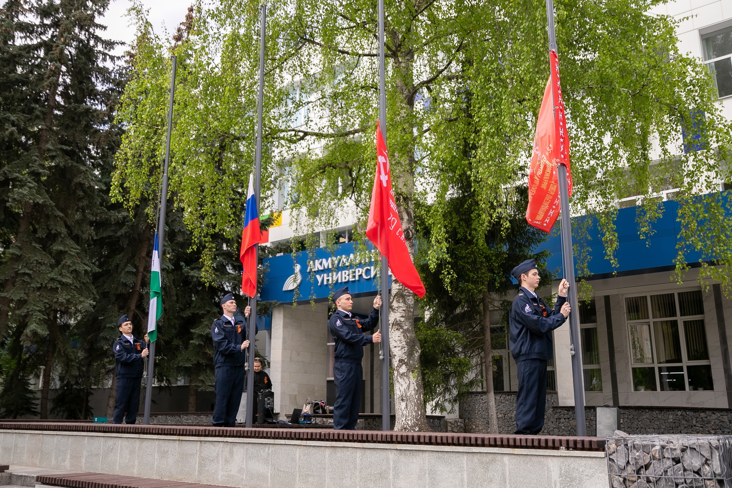 5 мая перед первым корпусом БГПУ им. М. Акмуллы состоялась торжественная церемония поднятия государственных флагов Российской Федерации, Республики Башкортостан, копий знамён Победы, 112-ой Башкирской кавалерийской дивизии.