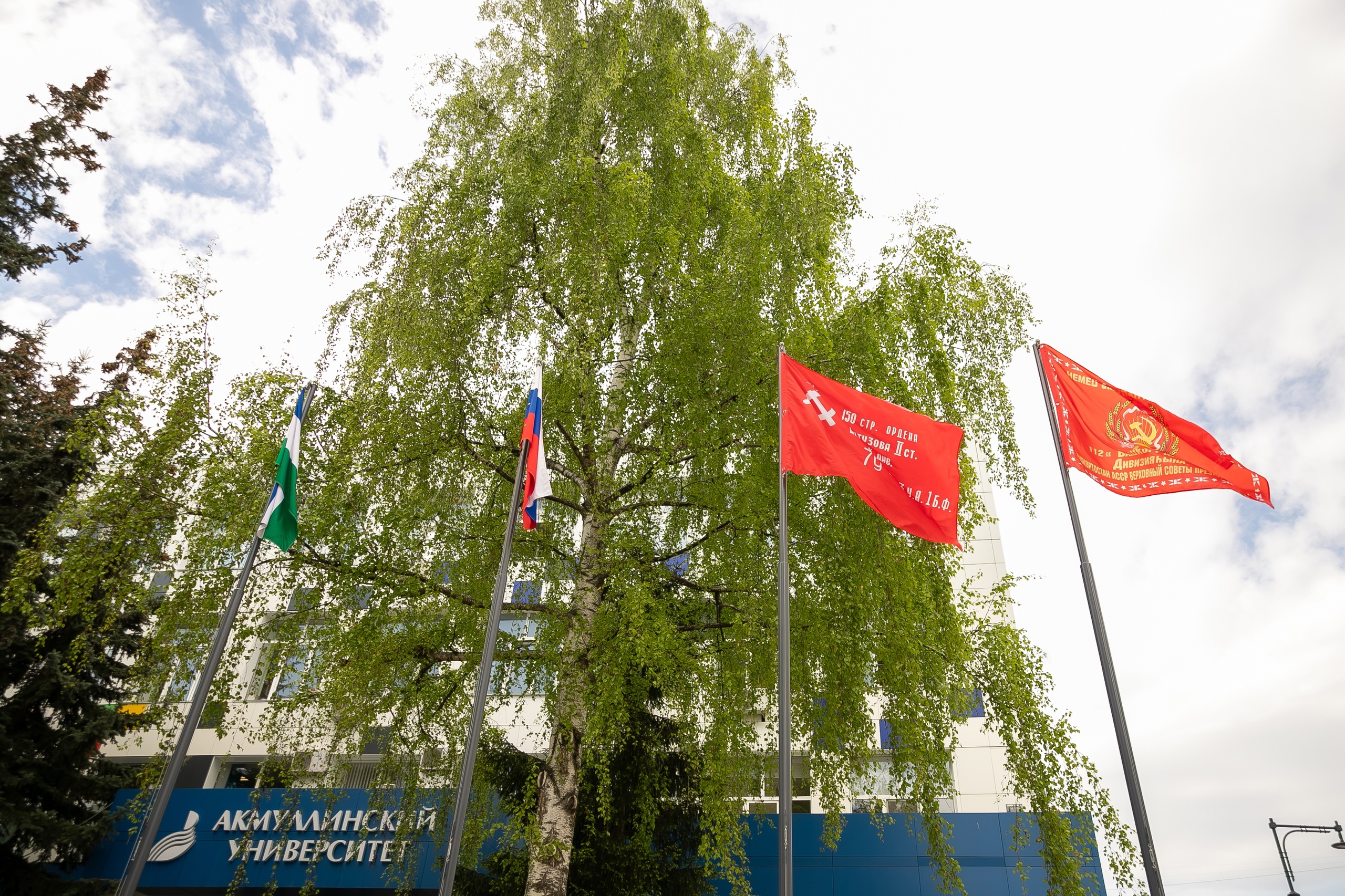 Накануне празднования 80-летия Великой Победы перед Акмуллинским университетом подняли флаги и знамёна