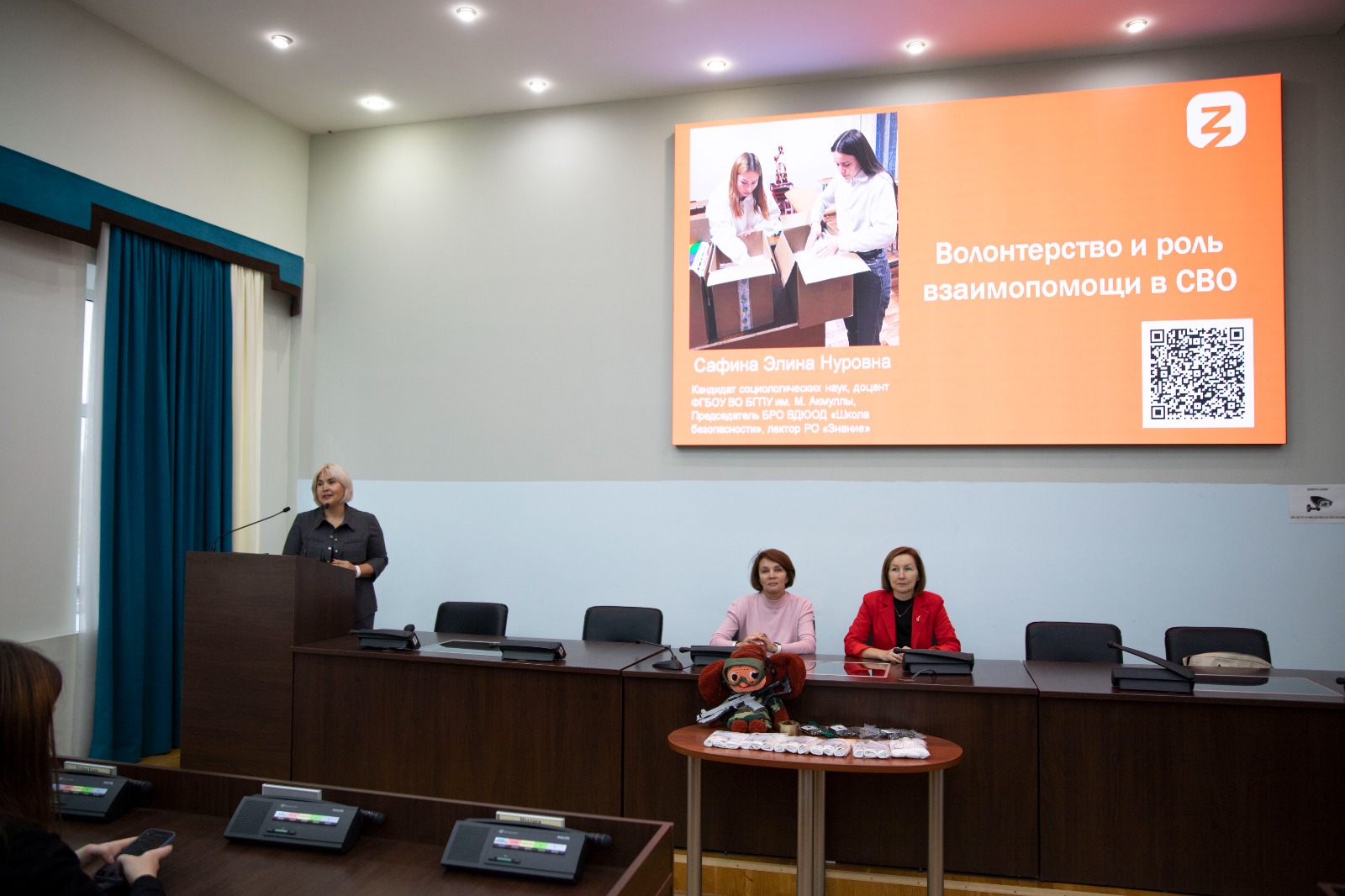Лектор подробно остановилась на деятельности движения «Мы за СВОих Уфа», с которым сотрудничает вместе с коллегами по кафедре Гульшат Мануйловой и Натальей Кузнецовой. Преподаватели и желающие студенты делают сухие души, пишут письма, собирают посылки для отправки в зону спецоперации.