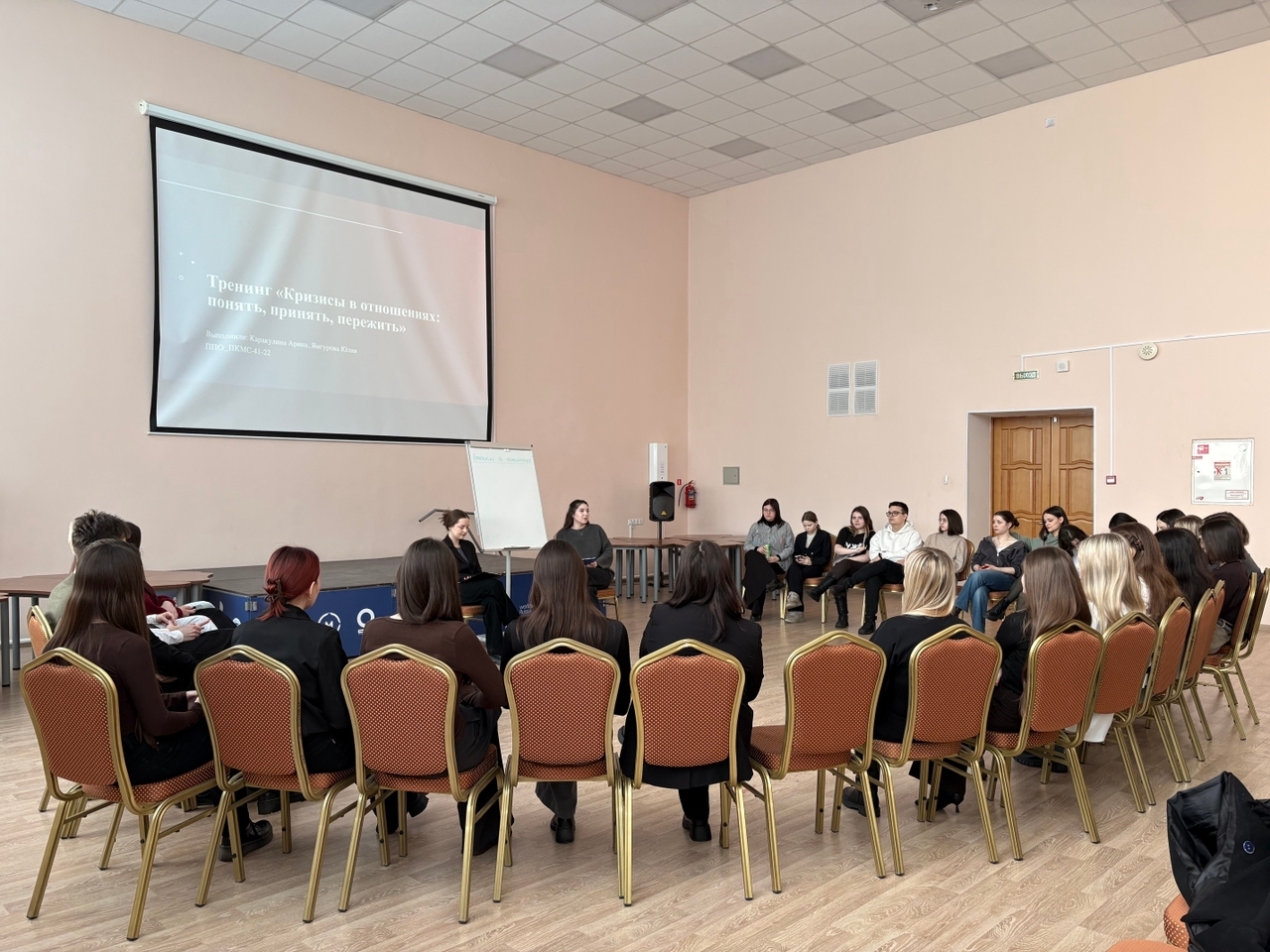 В этот же день в этом же месте двумя часами позже студенты выпускного курса факультета психологии провели тренинг «Кризисы в отношениях: понять, принять, пережить» для студентов младших курсов родного факультета . Целью тренинга было помочь участникам лучше понять природу конфликтов отношений, разобраться в причинах кризисов и познакомиться с экологичными способами их проживания.