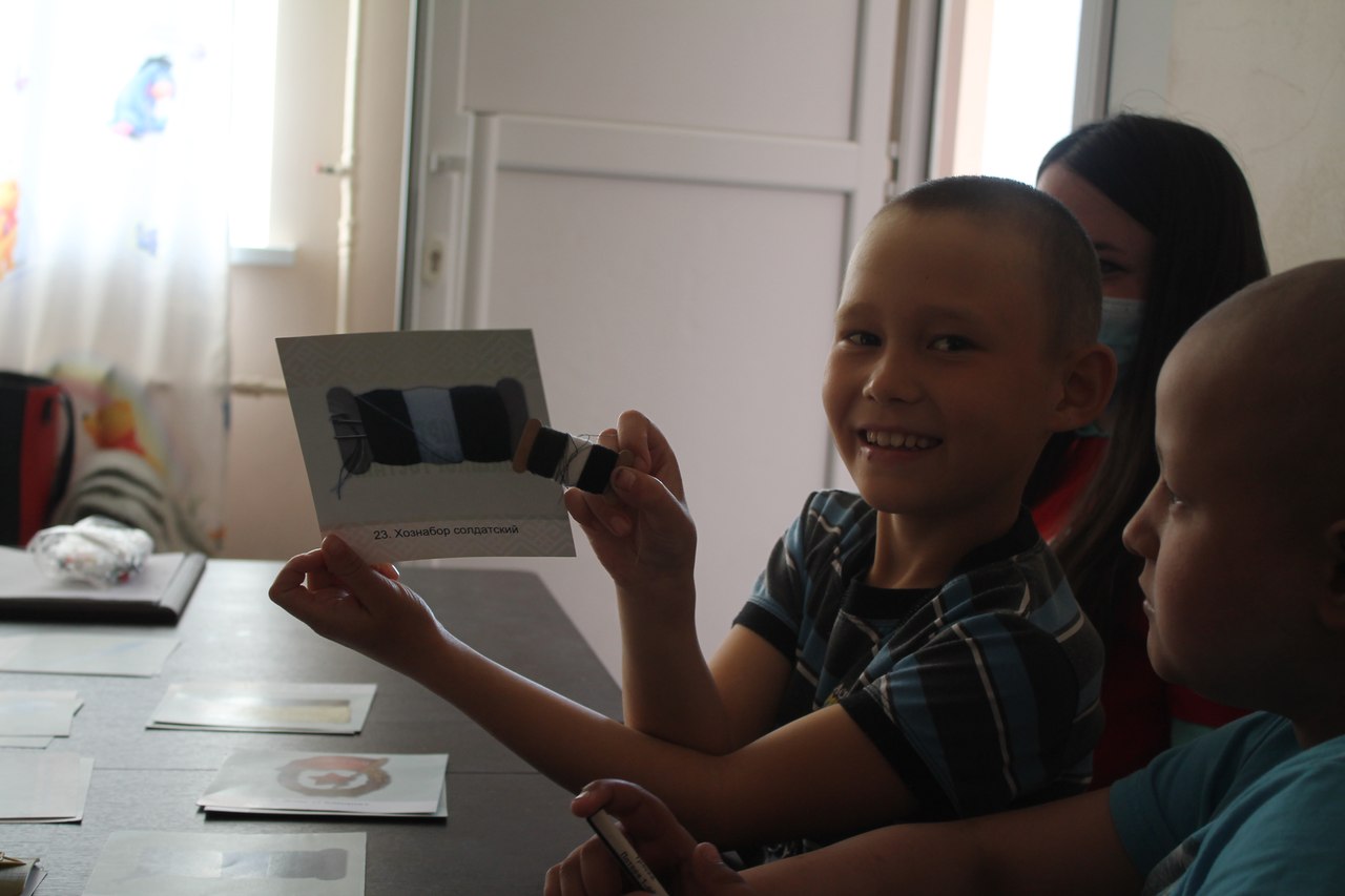 Школьник и малыши с интересом слушали факты о войне и подвигах советских солдат, раскладывали карточки и искали парные картинки.