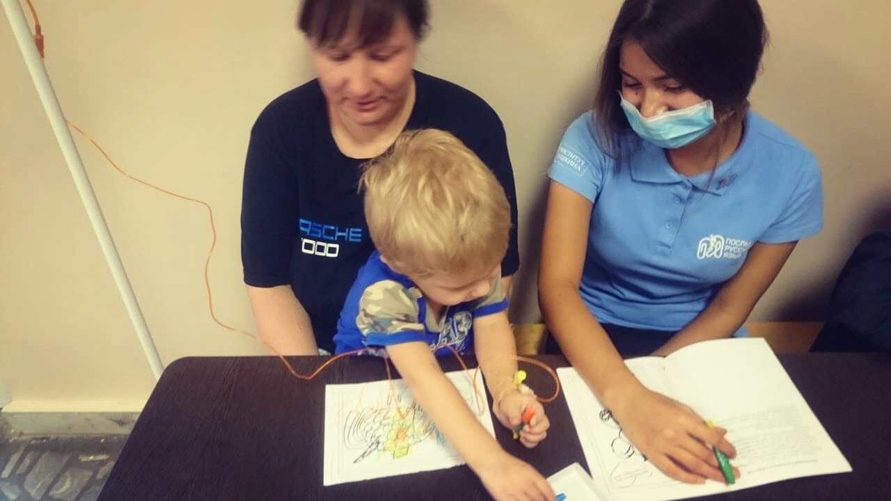 12 октября 2018 года руководитель волонтерского отряда "Палитра" Института педагогики и наш любимый "серебряный" волонтер, победитель Всероссийского грантового конкурса поддержки социальных проектов «Молоды душой» Екатерина Александровна Савельева вместе с волонтером отряда Дианой Акбутиной приняли участие в реализации социального проекта "Быть нужным-просто" и провели "Добрый урок" в рамках Всероссийской акции "Молоды душой" в Республиканской детской клинической больнице. Они вместе с ребятами и их родителями рисовали на специальных раскрасках, которые были созданы совместно с детьми из приютов и детских домов.