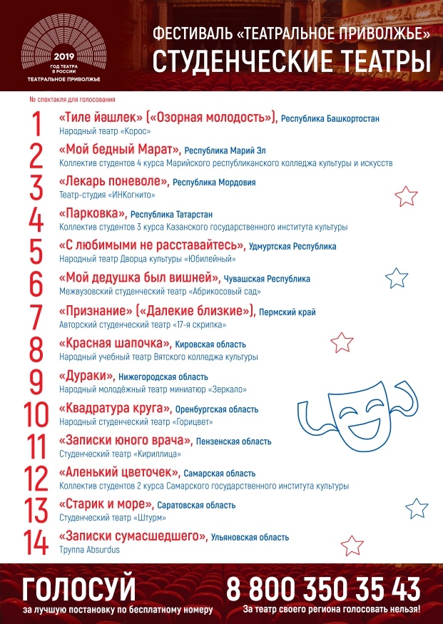 Каждый житель ПФО сможет отдать голос за лучшую театральную постановку, позвонив по бесплатному номеру 8 (800) 350-35-43. Голосование начнется  в 15.00 по уфимскому времени 29 ноября и продлится до 15.00 30 ноября. Для большей объективности и прозрачности конкурсного отбора действует правило – проголосовать можно за любую постановку, кроме спектакля из своего региона.