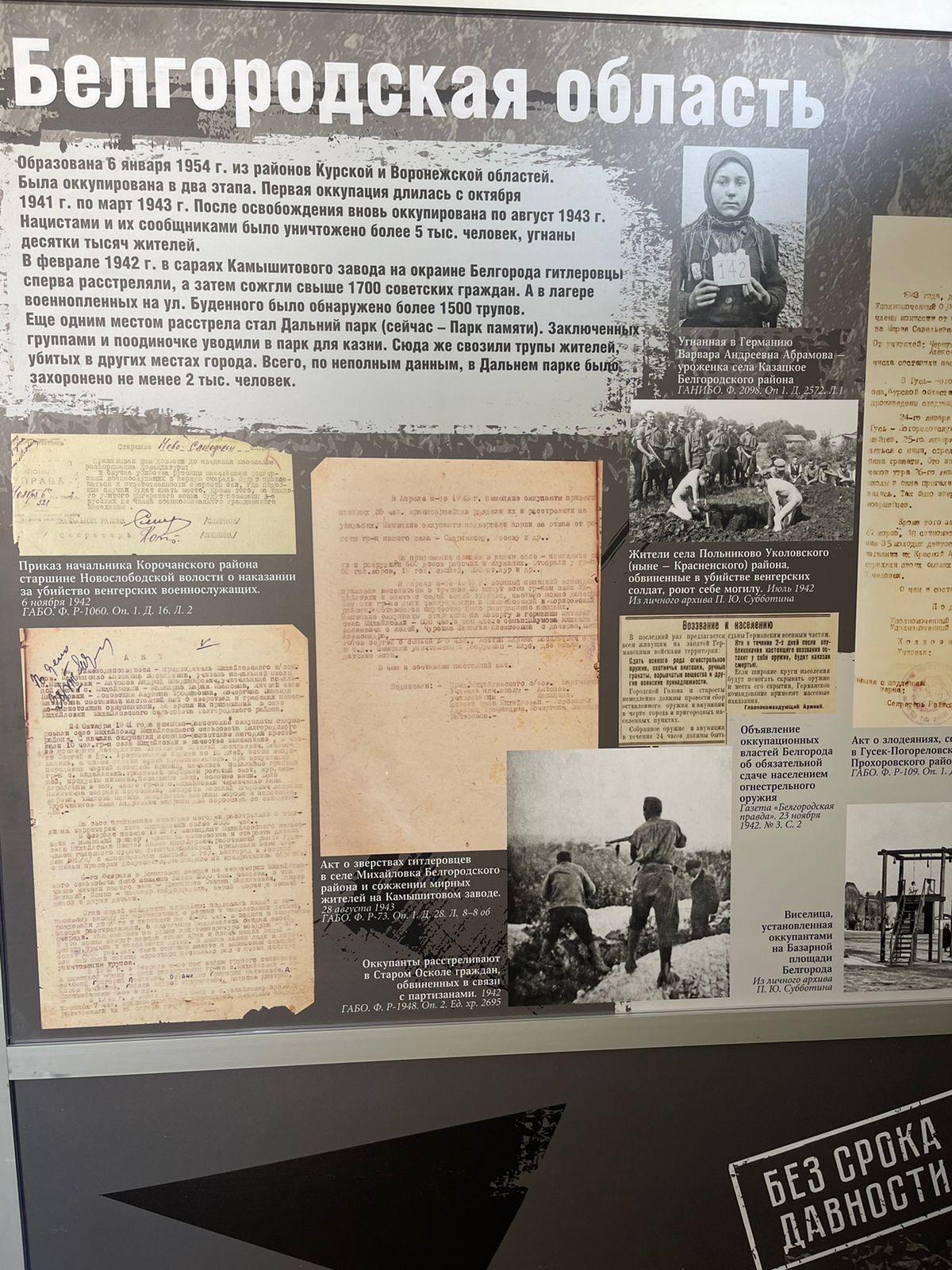 В Республике Башкортостан продолжает работу выставка «Без срока давности». 28 февраля 2022 года в учебном корпусе №7 БГПУ им М. Акмуллы состоялось открытие. Мероприятие прошло при участии учебно-методического центра военно-патриотического воспитания молодёжи Республики Башкортостан «Авангард» Республиканского детского оздоровительно-образовательного центра туризма, краеведения и экскурсий.