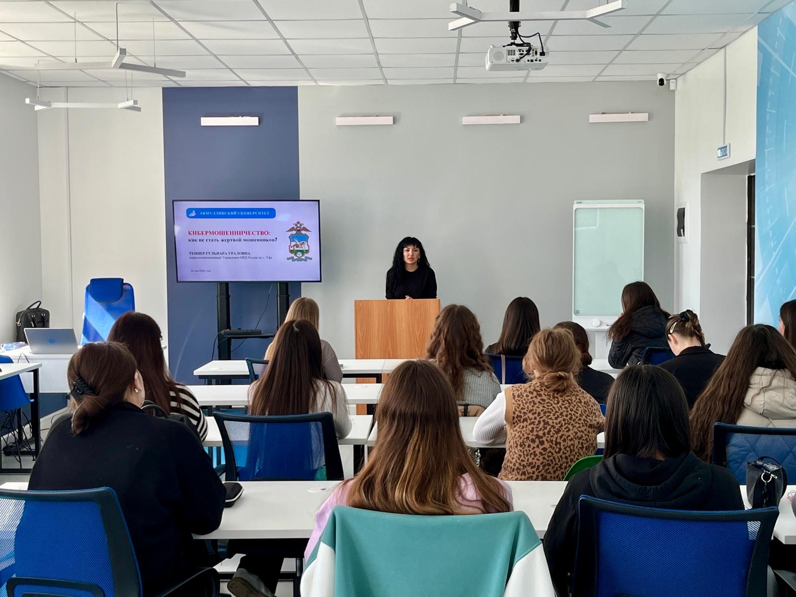 В рамках просветительской деятельности, направленной на повышение цифровой грамотности и информационной безопасности студентов, в Акмуллинском университете продолжаются встречи с представителями МВД России по городу Уфа. Они посвящены теме противодействия мошенничеству в сети Интернет.