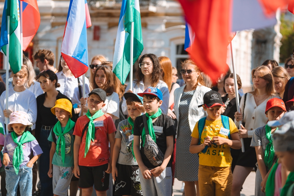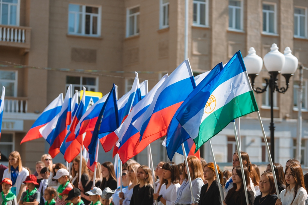 В честь Дня России в Акмуллинском университете состоялась особенная торжественная церемония поднятия флагов. В ней приняли участие студенты и преподаватели университета, а также школьники Уфы, посещающие летнюю «Акмуллинскую академию».