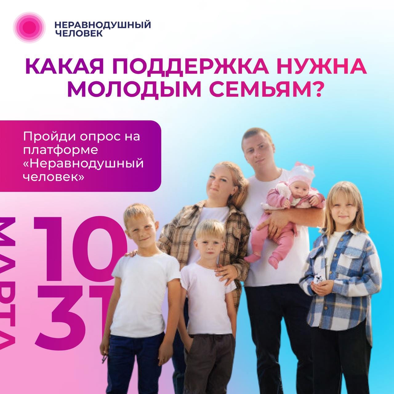 Государство постоянно обновляет меры поддержки молодых семей, а наше дело подсказать ему, на какую помощь реально рассчитывает молодое поколение. Чтобы помощь была по-настоящему полезной, лицам принимающим решения необходимо понимать установки молодёжи. Ваши ответы помогут сформировать взгляд поколения на институт семьи и понять актуальный запрос поколения на поддержку.