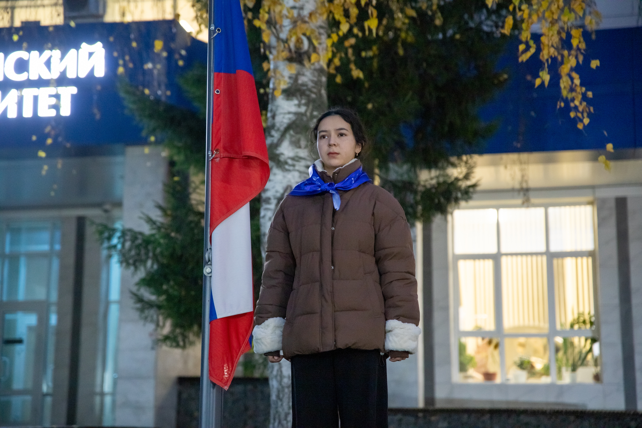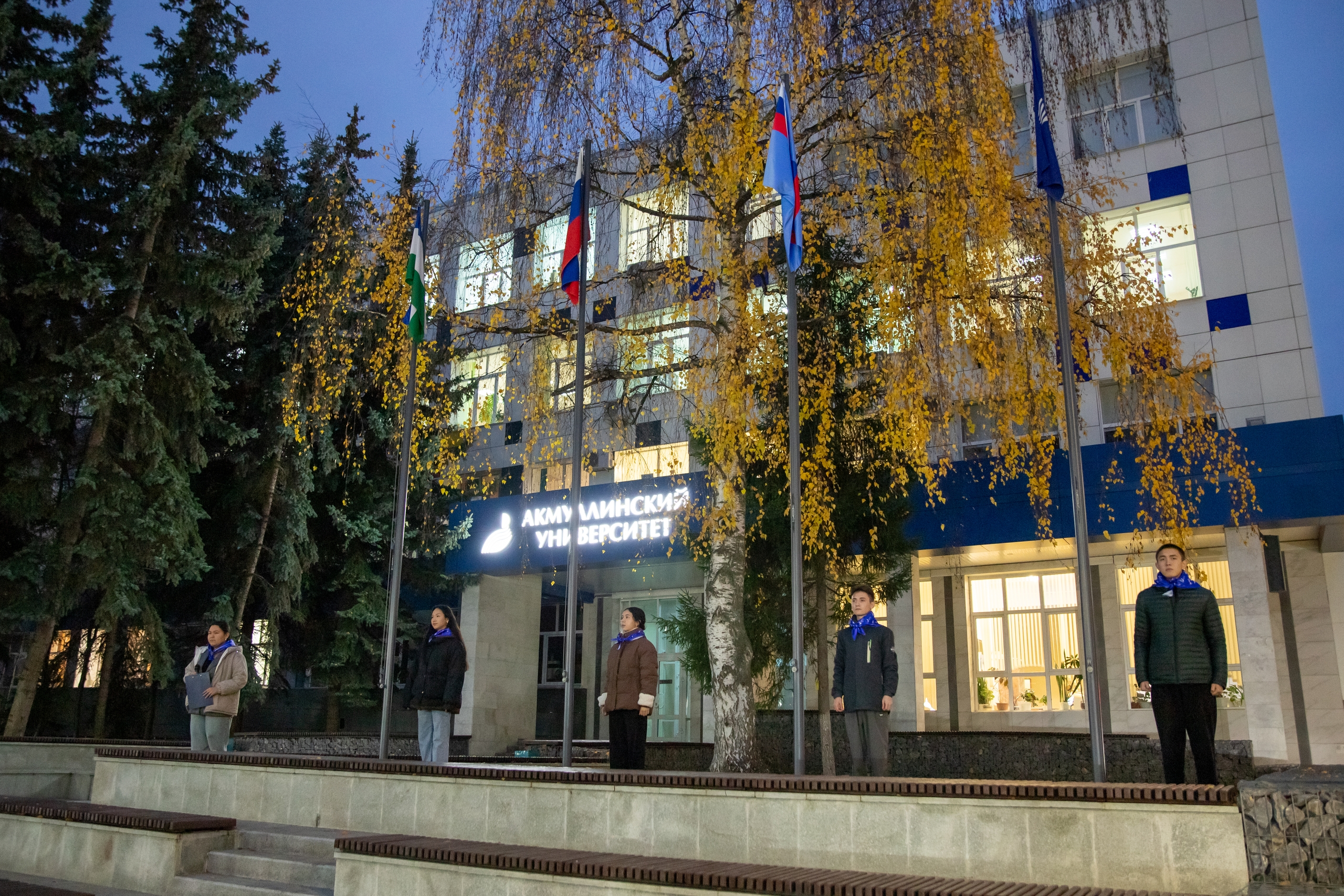 27 октября в Акмуллинском университете состоялась еженедельная торжественная церемония поднятия государственных флагов Российской Федерации, Республики Башкортостан, флагов Министерства просвещения России и Акмуллинского университета. В ней приняли участие студенты и преподаватели факультета башкирской филологии.
