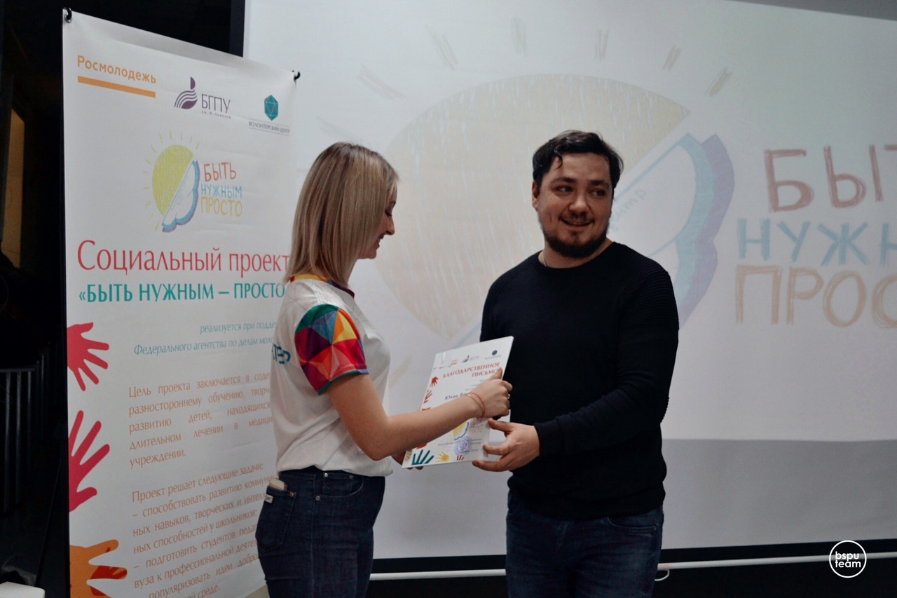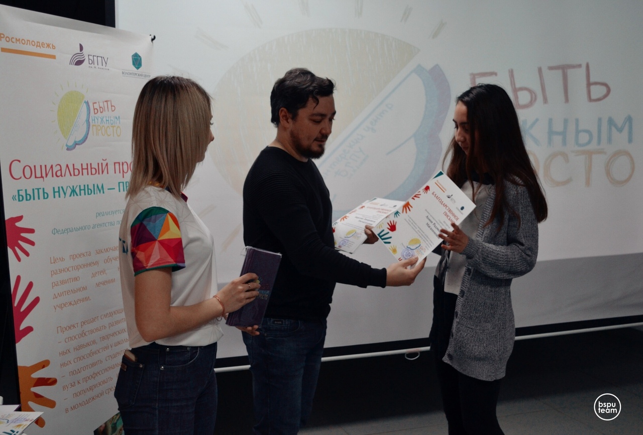 Благодаря реализации проекта «Быть нужным – просто» у школьников, проходящих лечение в больнице, появилась возможность получать от специально подготовленных добровольцев Волонтерского центра БГПУ им. М. Акмуллы полезную информацию по школьным предметам в рамках дополнительных учебных занятий, обучаться на тематических мастер-классах, расширять знания в области образования, науки, искусства.