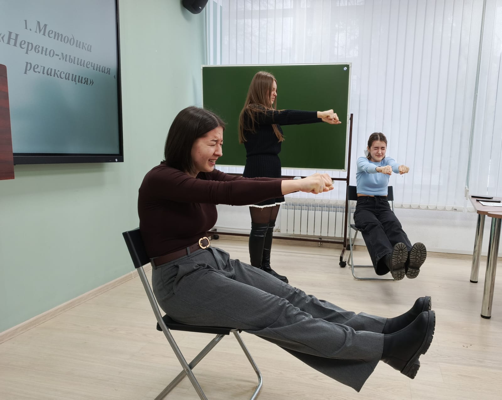 Ляйсан Г. продолжила тренинг, вовлекая всех в активное взаимодействие. Она провела методику "нервно-мышечной релаксации", где не просто объясняла, а выполняла упражнение вместе со студентами. Моменты, когда  все вместе напрягали и расслабляли мышцы, сопровождались смехом, что помогало снять напряжение. Ляйсан эмоционально подводила участников к каждому шагу, и это создало особую связь между ними.