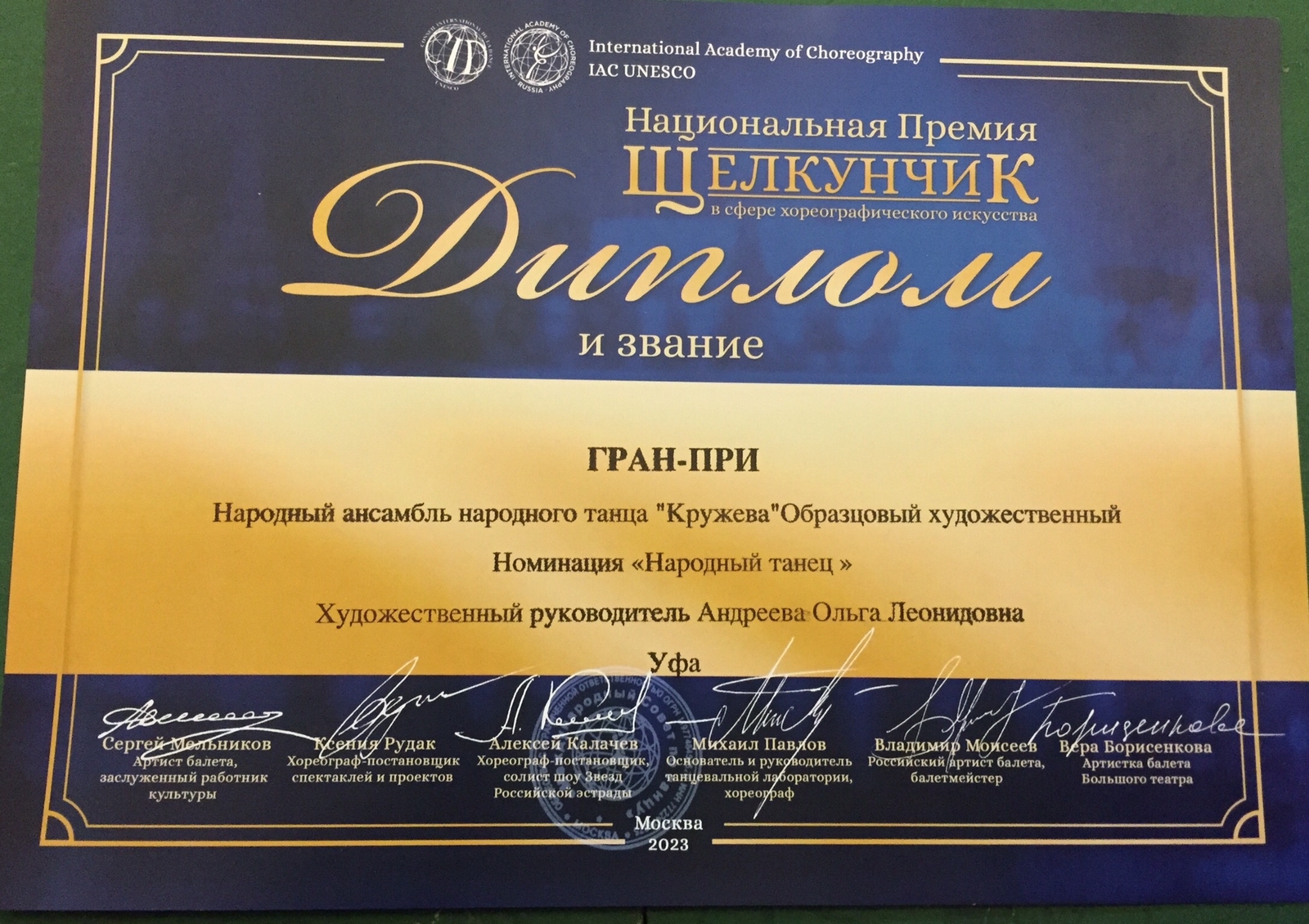Народный ансамбль народного танца «Кружева» является победителем международных, всероссийских, республиканских, городских танцевальных конкурсов и фестивалей. В репертуаре коллектива танцевальные композиции культуры башкирского, русского, татарского народов, а также народов Индии, Кореи, Мексики и многих других. Поздравляем коллектив и руководителя Ольгу Леонидовну с победой и желаем дальнейших творческих высот!