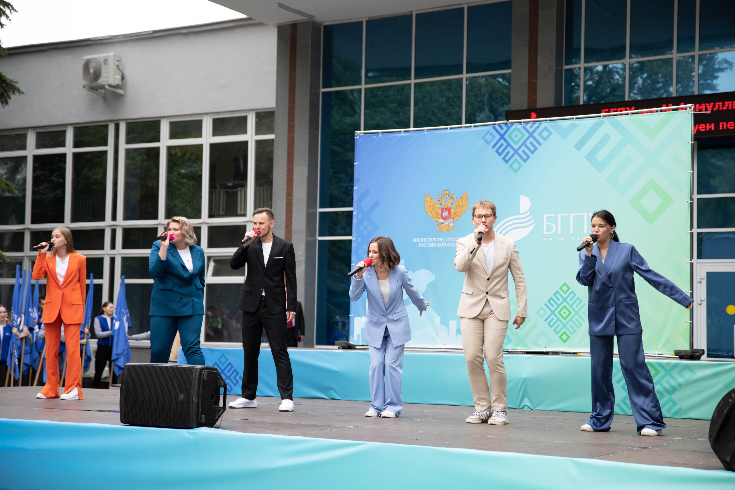 Праздничное мероприятие началось с торжественного выноса государственного флага России, флага Республики Башкортостан и знамени Башгоспедуниверситета.