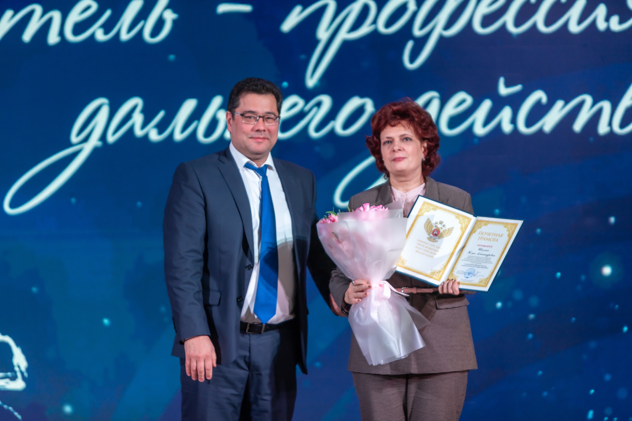 Руководитель вуза вручил преподавателям награды Министерства просвещения России. Почетной грамотой ведомства награждена заведующий кафедрой русской литературы Юлия Шанина. Знак отличия «Отличник просвещения» Минпросвещения РФ вручен доценту кафедры профессионального и социального образования Екатерине Трофимовой, а нагрудным знаком «Молодость и профессионализм» министерства награжден доцент кафедры теории и методики физической культуры и спорта Роман Кулешов.
