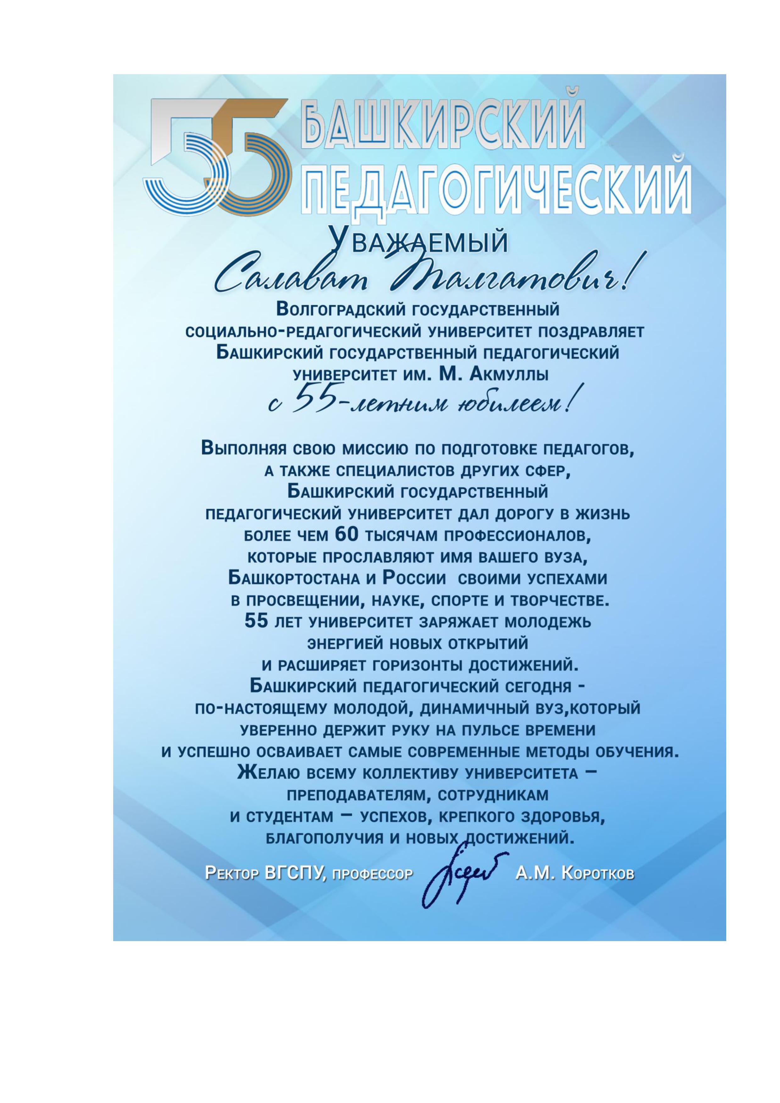 Поздравление Александра Михайловича Короткова, ректора Волгоградского государственного социально-педагогического университета